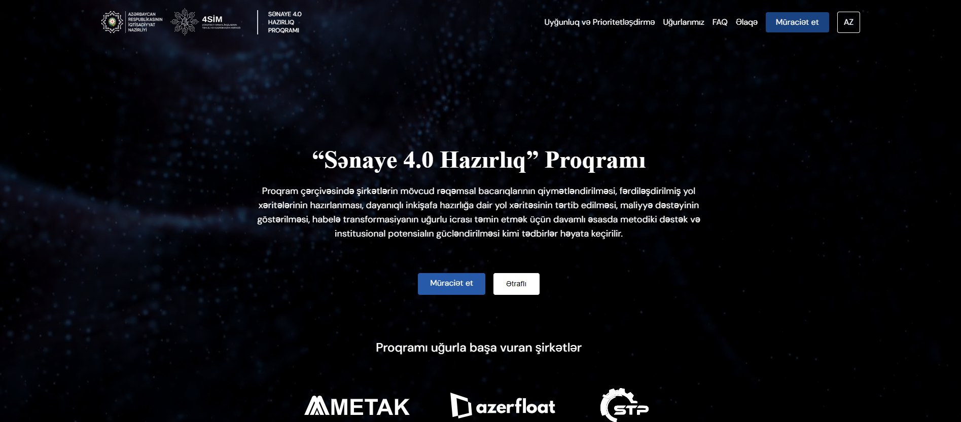 Artıq proqrama qoşulmaların sürətləndirilməsinə hesablanan “industry4.az” portalı müraciətləri qəbul etməyə hazır vəziyyətə gətirilib. Portal bu proqrama vaxt itirmədən və uzaqdan qoşulmaq istəyən iqtisadi subyektlər üçün nəzərdə tutulub. İlk baxışdan sadə quruluşu ilə diqqət çəkən saytda “Müraciət et” bölməsi vasitəsilə proqrama qoşulmaq üçün ilkin müraciət etmək əlçatandır.