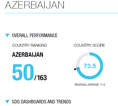 Birləşmiş Millətlər Təşkilatının “Dayanıqlı inkişaf-2022” hesabatında Azərbaycan mümkün 100 baldan 73,5 bal toplayaraq 163 ölkə arasında 50-ci pillədə qərarlaşıb. Bu göstərici ilə ölkəmiz 2021-ci il üzrə hesabatdakı mövqeyi ilə müqayisədə (55-ci yer) 2022-ci ilin hesabatında 5 pillə irəliləyərək dünyada hər üç ölkədən ikisini qabaqlayıb və bu göstəriciyə əsasən Cənubi Qafqaz regionunda liderdir.