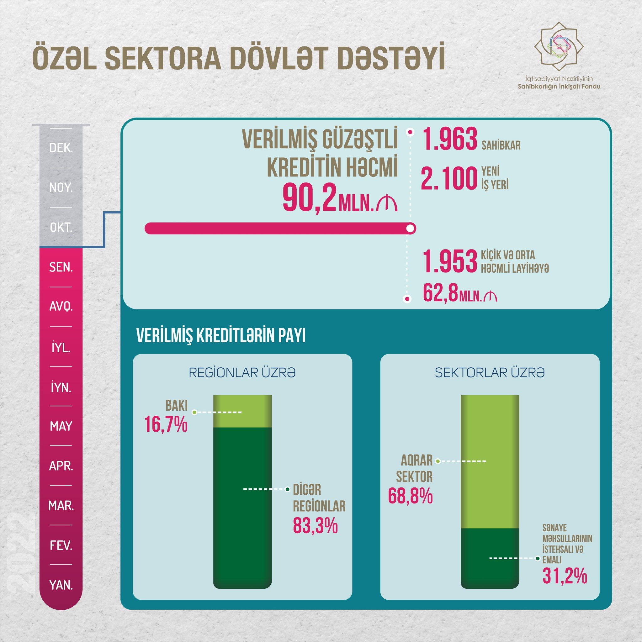 "Sahibkarlığın İnkişafı Fondu tərəfindən bu ilin əvvəlindən 1.963 sahibkara 90,2 mln. manat, o cümlədən 1.953 kiçik və orta həcmli layihəyə 62,8 mln. manat güzəştli kredit verilib. Bu kreditlər hesabına 2.100-ə yaxın yeni iş yerinin açılması imkanı yaranıb".