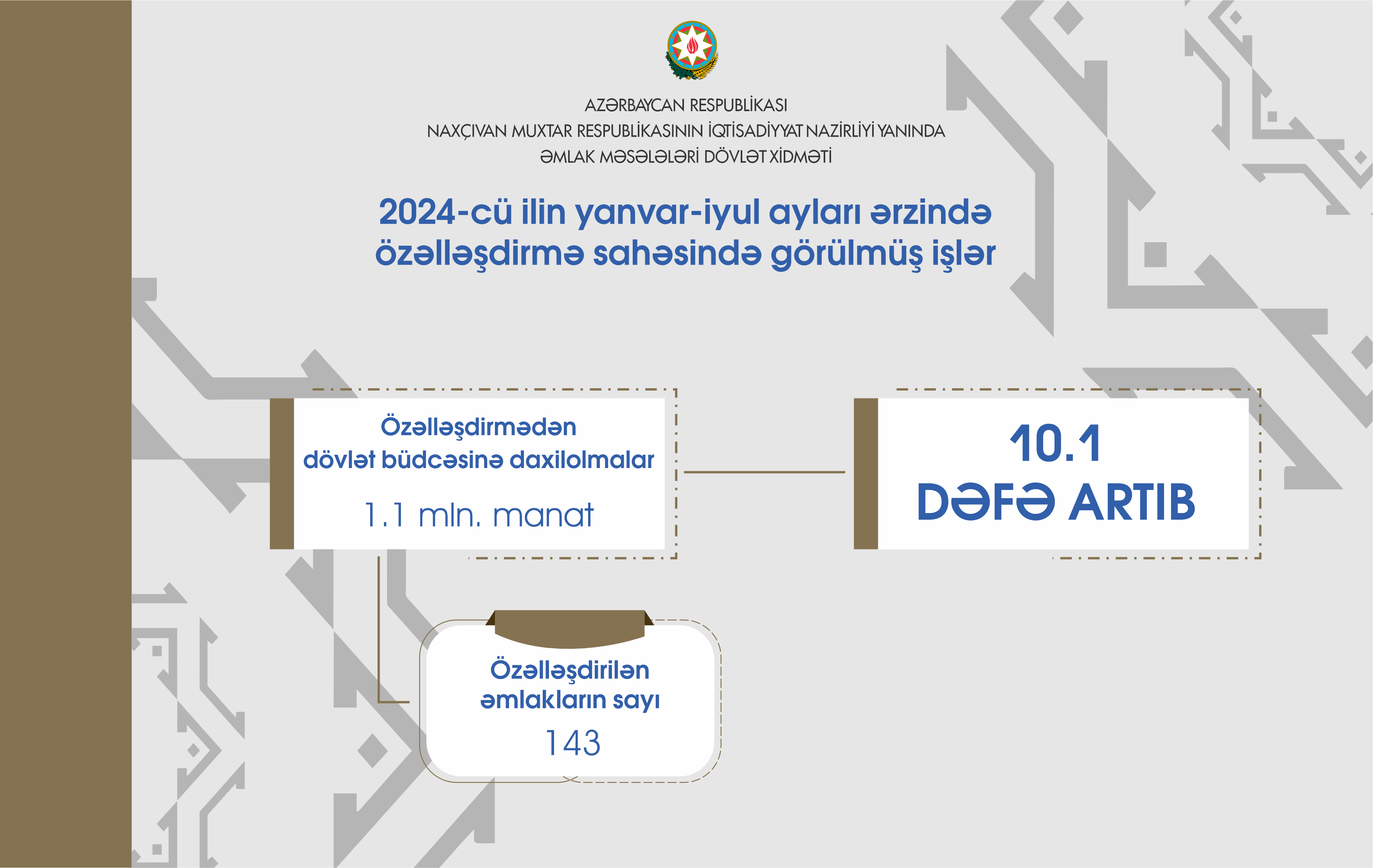 Bu ilin yanvar-iyul ayları ərzində Naxçıvan Muxtar Respublikasının İqtisadiyyat Nazirliyi yanında Əmlak Məsələləri Dövlət Xidməti tərəfindən 143 dövlət əmlakı özəlləşdirilib.