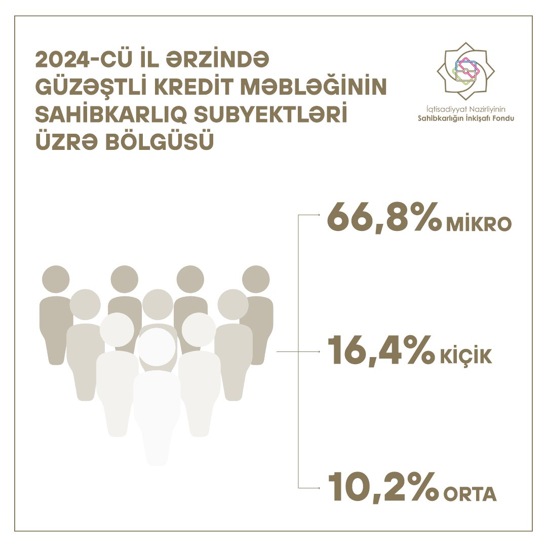 2024-cü il ərzində Sahibkarlığın İnkişafı Fondunun güzəştli kreditlərindən yararlanmış layihələrin 99,8 faizi, kredit məbləğinin isə 93,4 faizi mikro, kiçik və orta sahibkarlıq subyektlərinə aid olub.