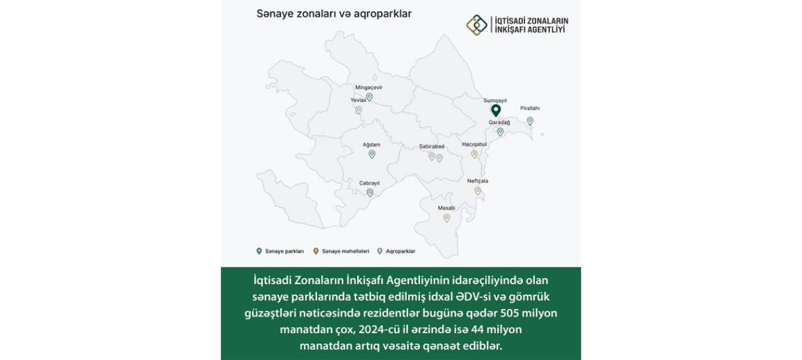 Bundan başqa, sənaye parklarının rezidentləri qeydiyyata alındıqları tarixdən etibarən 10 il müddətinə əmlak, torpaq, gəlir vergilərindən, həmçinin istehsal məqsədilə texnikanın, texnoloji avadanlıqların və qurğuların idxalı zamanı ƏDV-dən və gömrük rüsumlarından tam azad olunurlar. Bir maraqlı məqamı diqqətə çatdırım ki, İqtisadi Zonaların İnkişafı Agentliyinin idarəçiliyində olan sənaye parklarında tətbiq edilmiş idxal ƏDV-si və gömrük güzəştləri nəticəsində rezidentlər bu günə qədər 505 milyon manatdan çox, 2024-cü il ərzində isə 44 milyon manatdan artıq vəsaitə qənaət ediblər.