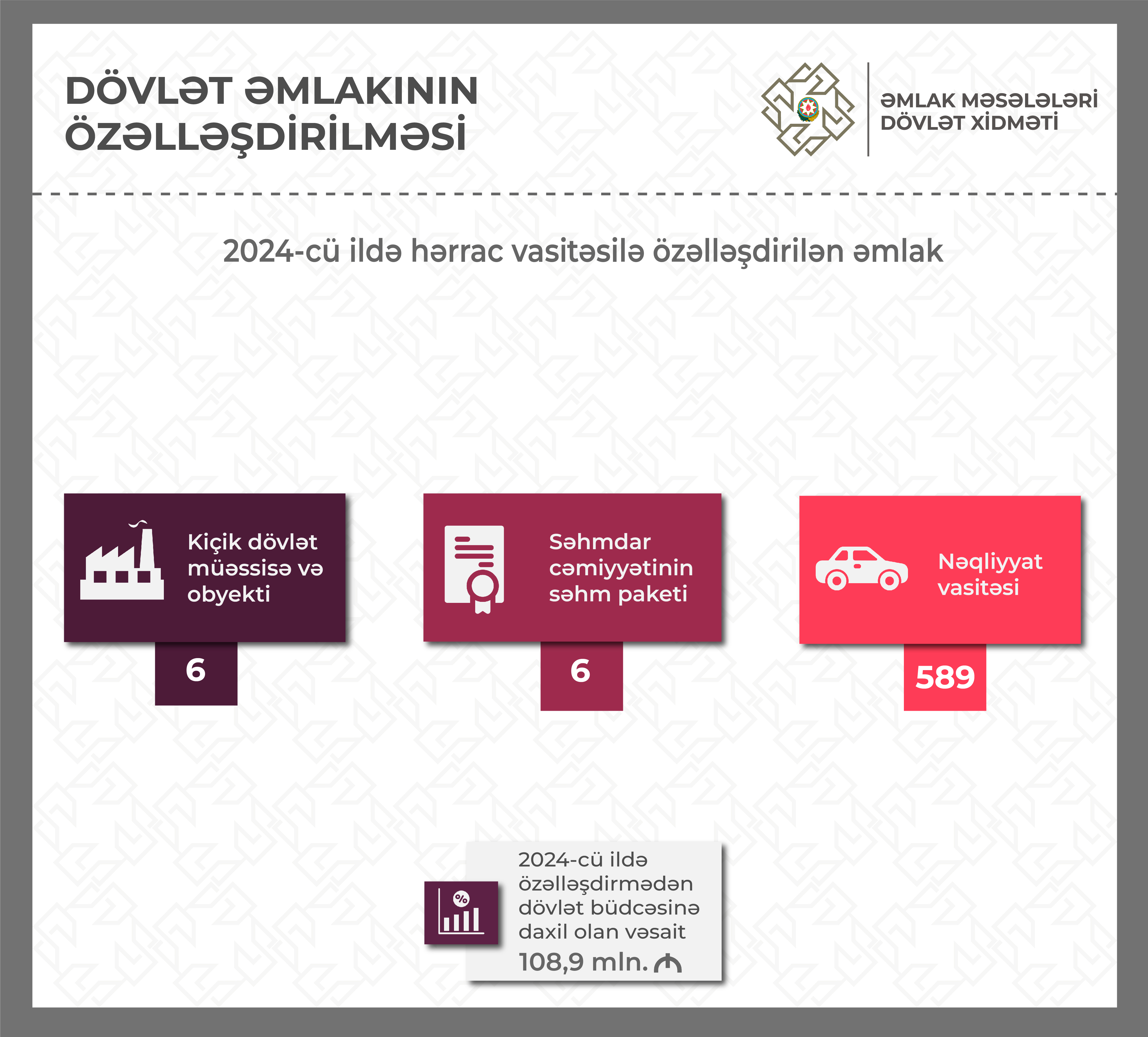 2024-cü ildə 45 hərrac keçirilib. Hərraclarda 6 səhmdar cəmiyyətinin səhm paketi, 6 kiçik dövlət müəssisəsi və 589 nəqliyyat vasitəsi özəlləşdirilib. Ötən il ərzində hərraca çıxarılmış dövlət əmlakı üzrə 402 elektron sifariş qəbul edilib, hərraclarda iştirak etmək məqsədilə “Elektron hərrac” proqram təminatı vasitəsilə 56 onlayn qoşulma reallaşıb.