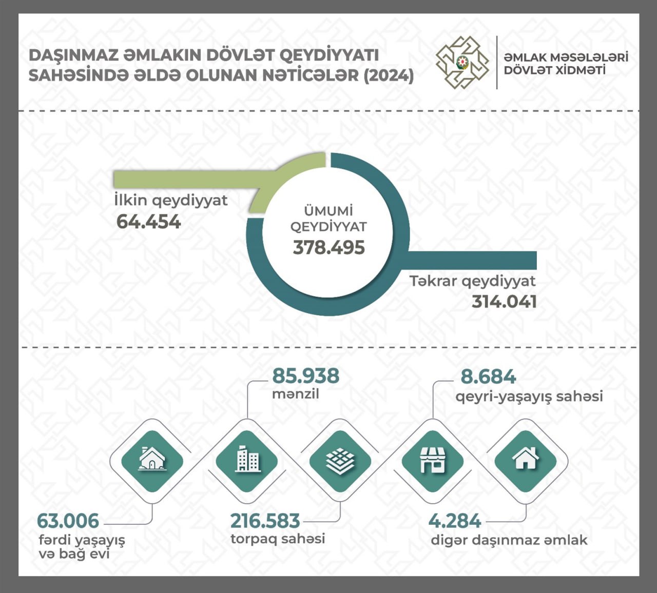 2024-cü il ərzində daşınmaz əmlak üzərində 378 495 mülkiyyət hüququ qeydiyyata alınaraq çıxarışla təmin edilib.