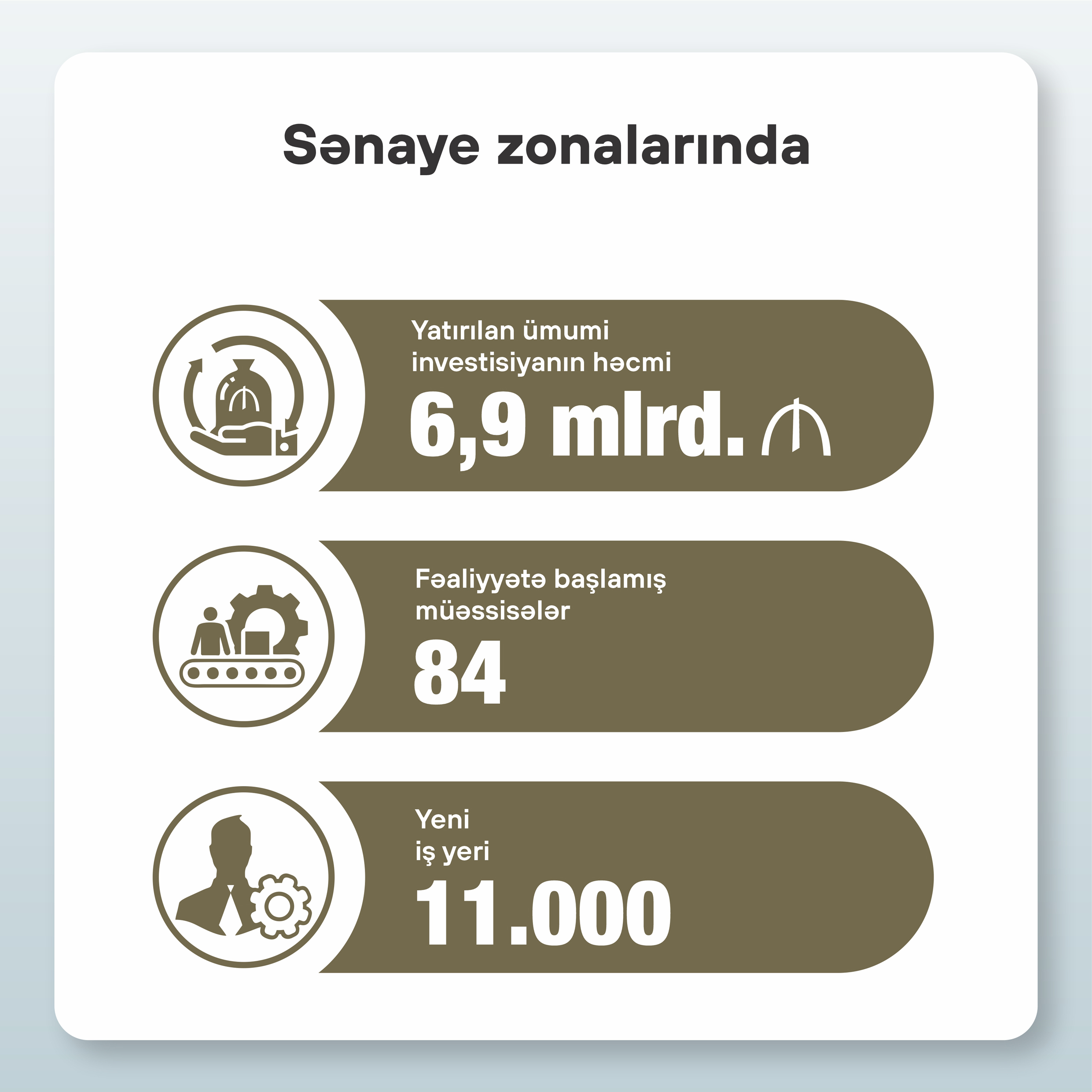 Sənaye zonalarına indiyədək yatırılan ümumi investisiyanın həcmi 6,9 milyard manat təşkil edib. Hazırda bu zonalarda 84 müəssisə fəaliyyətə başlayıb və 11000-ə yaxın yeni iş yeri yaradılıb.
