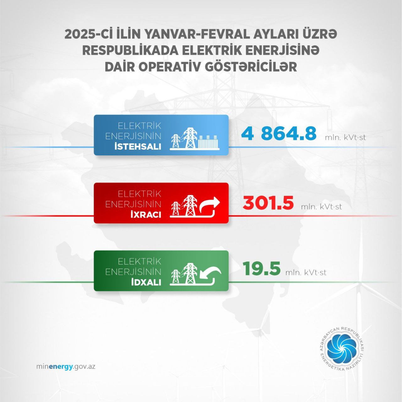 Bu ilin yanvar–fevral ayları üzrə operativ məlumatlara əsasən, elektrik enerjisinin istehsalı 4 864,8 mln. kVt·st, ixracı 301,5 mln. kVt·st, idxalı isə 19,5 mln. kVt·st olub.