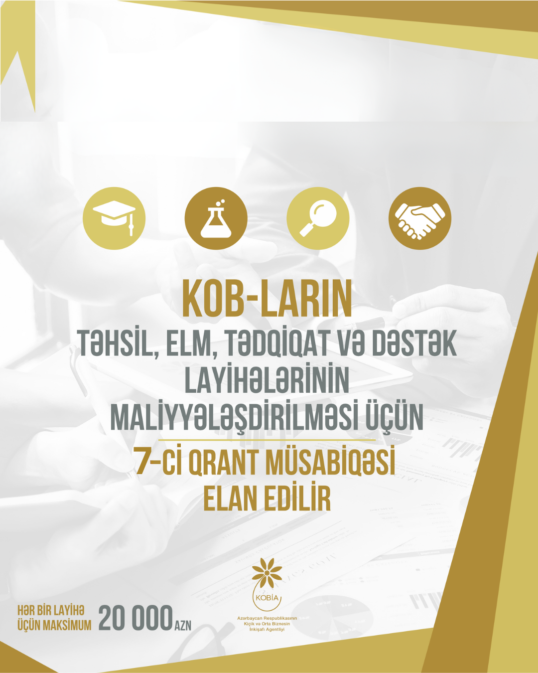 Mikro, kiçik və orta sahibkarlıq subyektlərinin təhsil, elm, tədqiqat və dəstək layihələrinin maliyyələşdirilməsinə dəstək məqsədilə Kiçik və Orta Biznesin İnkişafı Agentliyi (KOBİA) tərəfindən 7-ci qrant müsabiqəsi elan edilir.