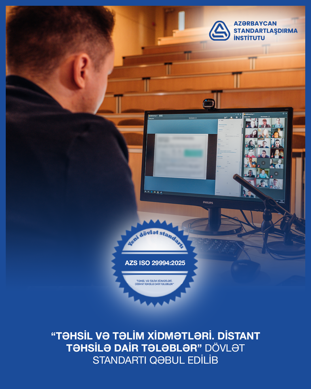 Azərbaycan Standartlaşdırma İnstitutu (AZSTAND) tərəfindən beynəlxalq standart əsasında AZS ISO 29994:2025 “Təhsil və təlim xidmətləri. Distant təhsilə dair tələblər” yeni dövlət standartı qəbul edilib.