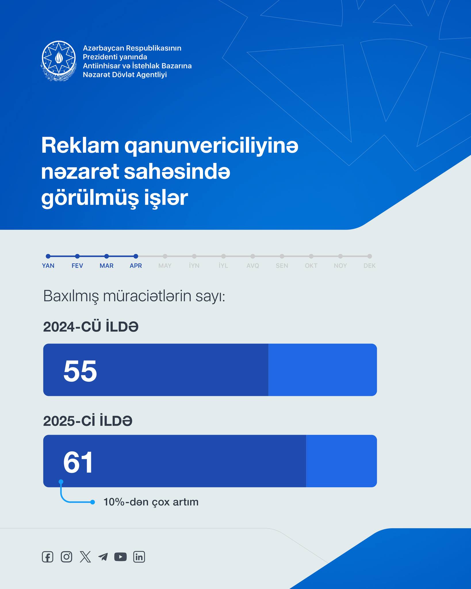 Cari ilin yanvar-aprel ayları ərzində qanunsuz reklamların yayımı ilə əlaqədar Antiinhisar və İstehlak Bazarına Nəzarət Dövlət Agentliyi tərəfindən baxılmış müraciətlərin sayında ötən ilin müvafiq dövrü ilə müqayisədə 10 faizdən çox artım qeydə alınıb. Belə ki, 2024-cü ilin ilk dörd ayında 55, 2025-ci ilin müvafiq dövründə isə 61 müraciətə baxılıb.