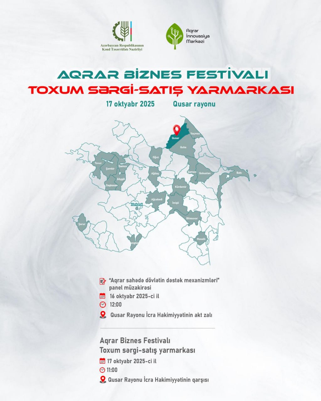 Kənd Təsərrüfatı Nazirliyinin məlumatına görə, oktyabrın 17-də isə Rayon İcra Hakimiyyəti binasının qarşısında növbəti Aqrar Biznes Festivalı və toxum sərgi-satış yarmarkası baş tutacaq.