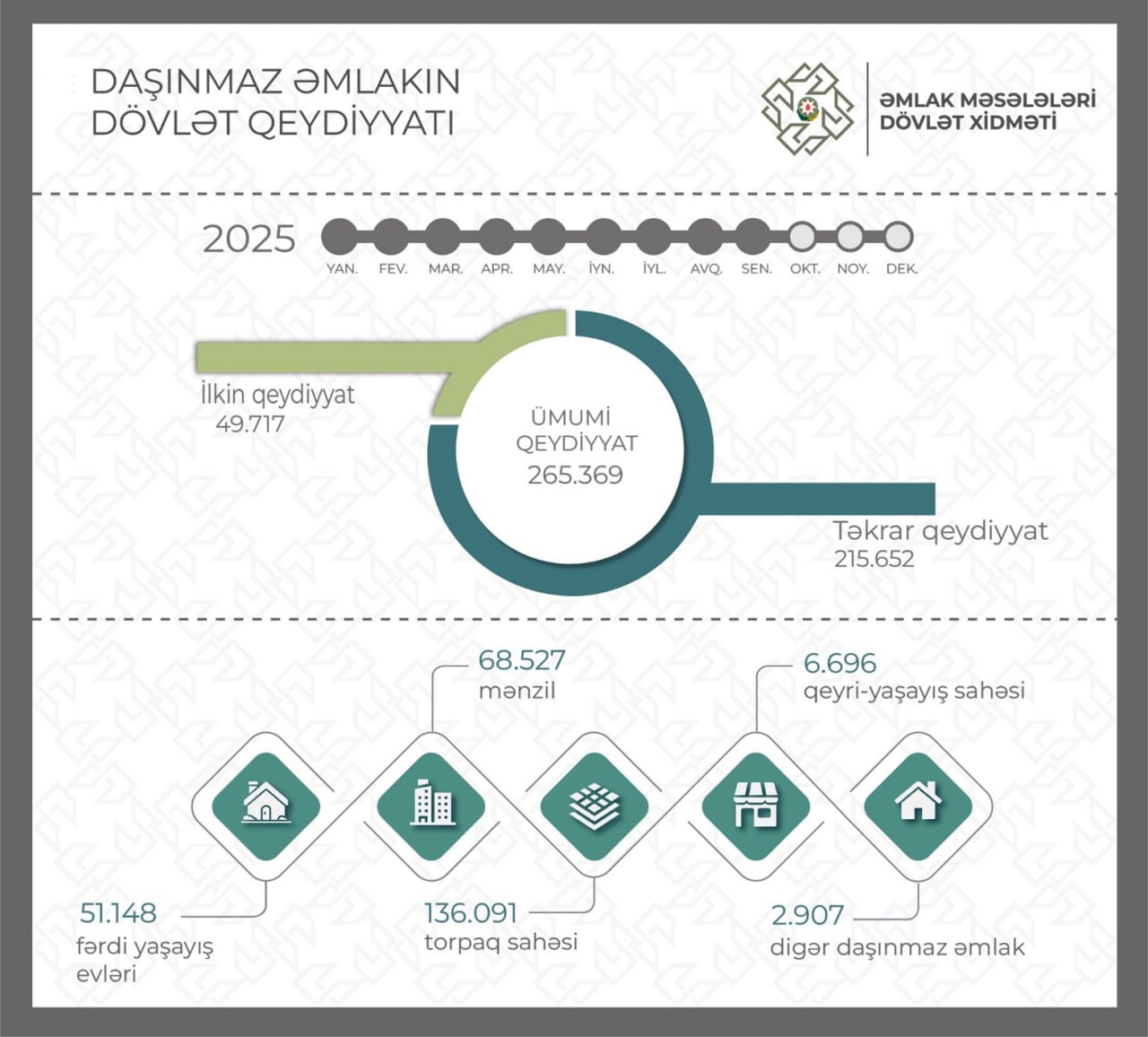 2025-ci ilin yanvar-sentyabr ayları ərzində daşınmaz əmlak üzərində 265 369 mülkiyyət hüququ qeydiyyata alınaraq çıxarışla təmin edilib.