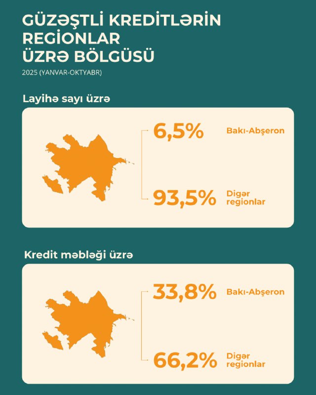 Bu dövrdə verilən güzəştli kreditlərin məbləğə görə bölgüsündə isə 33,8 faiz Bakı şəhəri və Abşeron iqtisadi rayonunun, 66,2 faizi isə digər regionların payına düşüb.