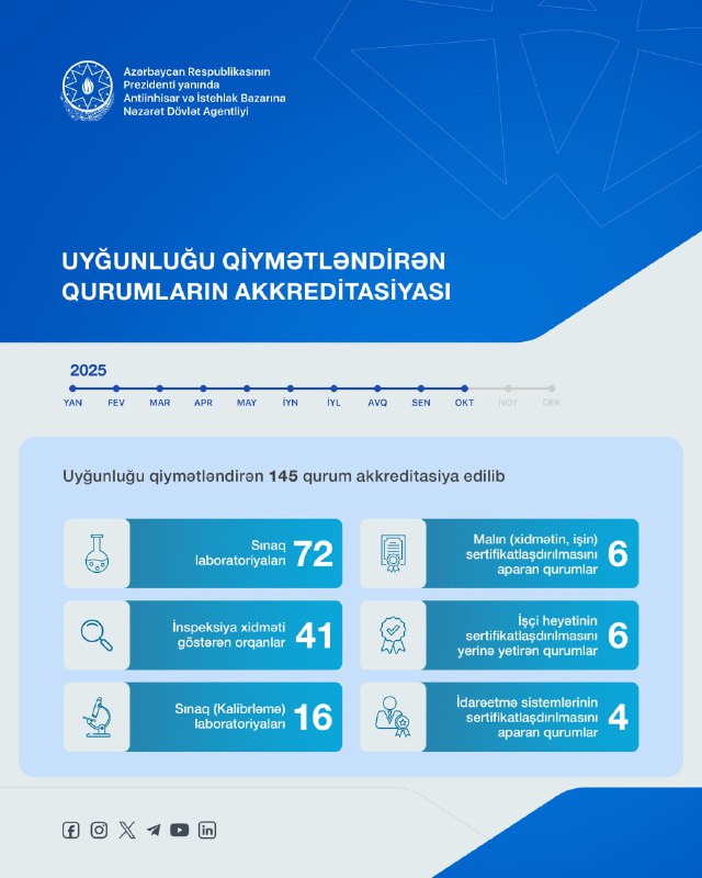 2025-ci ilin yanvar-oktyabr ayları ərzində Antiinhisar və İstehlak Bazarına Nəzarət Dövlət Agentliyinin tabeliyində olan Azərbaycan Akkreditasiya Mərkəzi tərəfindən uyğunluğu qiymətləndirən 145 qurum akkreditasiya edilib.