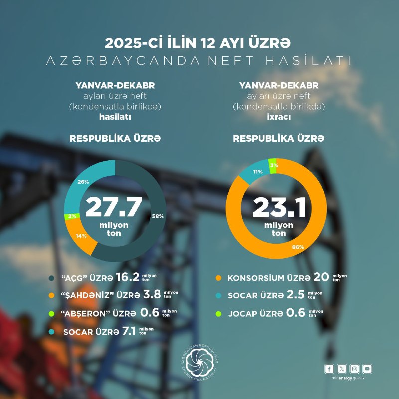 2025-ci il üzrə operativ məlumatlara əsasən, respublikada 27,7 milyon ton neft (qaz kondensatı ilə birlikdə) hasil edilib.