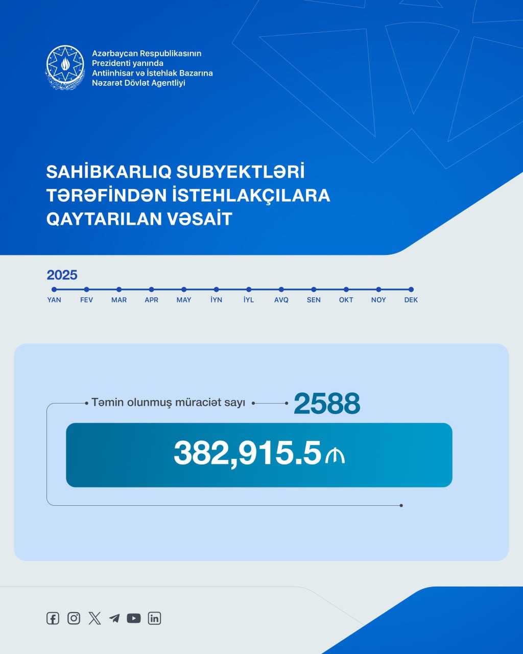 2025-ci il ərzində təmin olunan 2588 istehlakçı müraciəti əsasında ümumilikdə 383 min manatadək vəsait sahibkarlıq subyektləri tərəfindən istehlakçılara qaytarılıb.