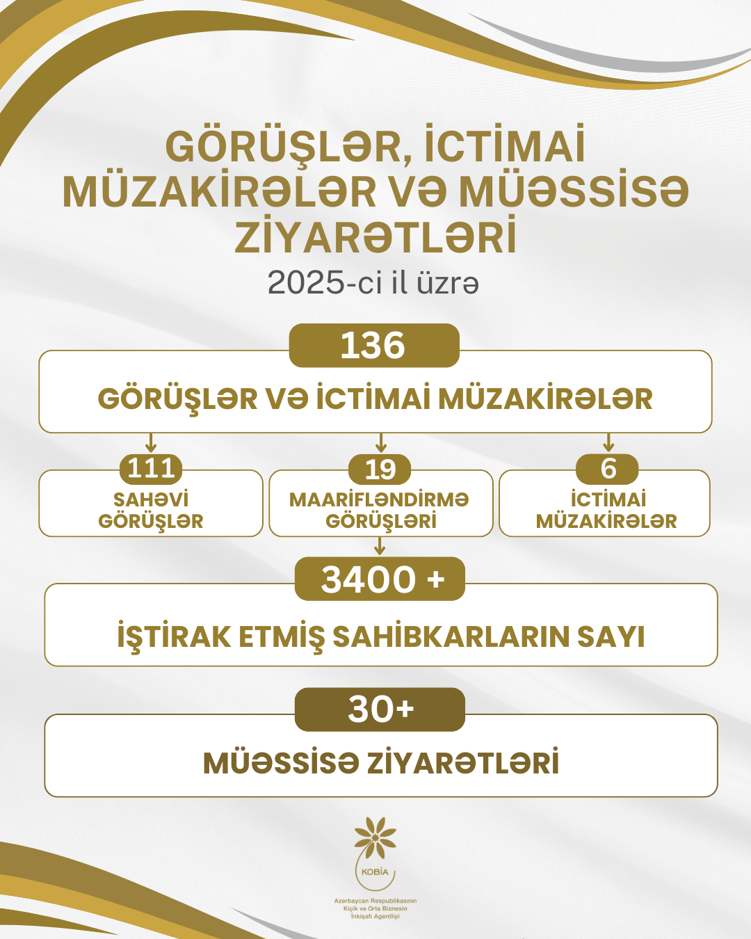 2025-ci ildə 2800-dən çox sahibkarın iştirakı ilə 130 görüş təşkil olunub. Görüşlərin 111-i sahəvi, 19-u isə maarifləndirmə xarakterli olub. Tədbirlər kənd təsərrüfatı, turizm, sənaye, qida istehsalı, idxal-ixrac, KOB klasterləri, qadın və gənc sahibkarlıq kimi aktual mövzuları əhatə edib. Aidiyyəti dövlət qurumlarının iştirakı ilə keçirilən görüşlər sahibkarların qarşılaşdıqları məsələlərin öyrənilməsi, təkliflərinin qeydə alınması və suallarının operativ cavablandırılması baxımından effektiv platforma rolunu oynayıb. Ötən il KOBİA yanında İctimai Şuranın təşkilatçılığı ilə 6 ictimai müzakirə təşkil olunub ki, bu tədbirlərdə 400-dən çox sahibkar iştirak edib. Biznes mühitinin yaxşılaşdırılmasına yönələn aktual mövzulara həsr olunmuş ictimai müzakirələr dövlət qurumları, biznes assosiasiyalar və sahibkarlar arasında qarşılıqlı əməkdaşlığın gücləndirilməsinə töhfə verib.