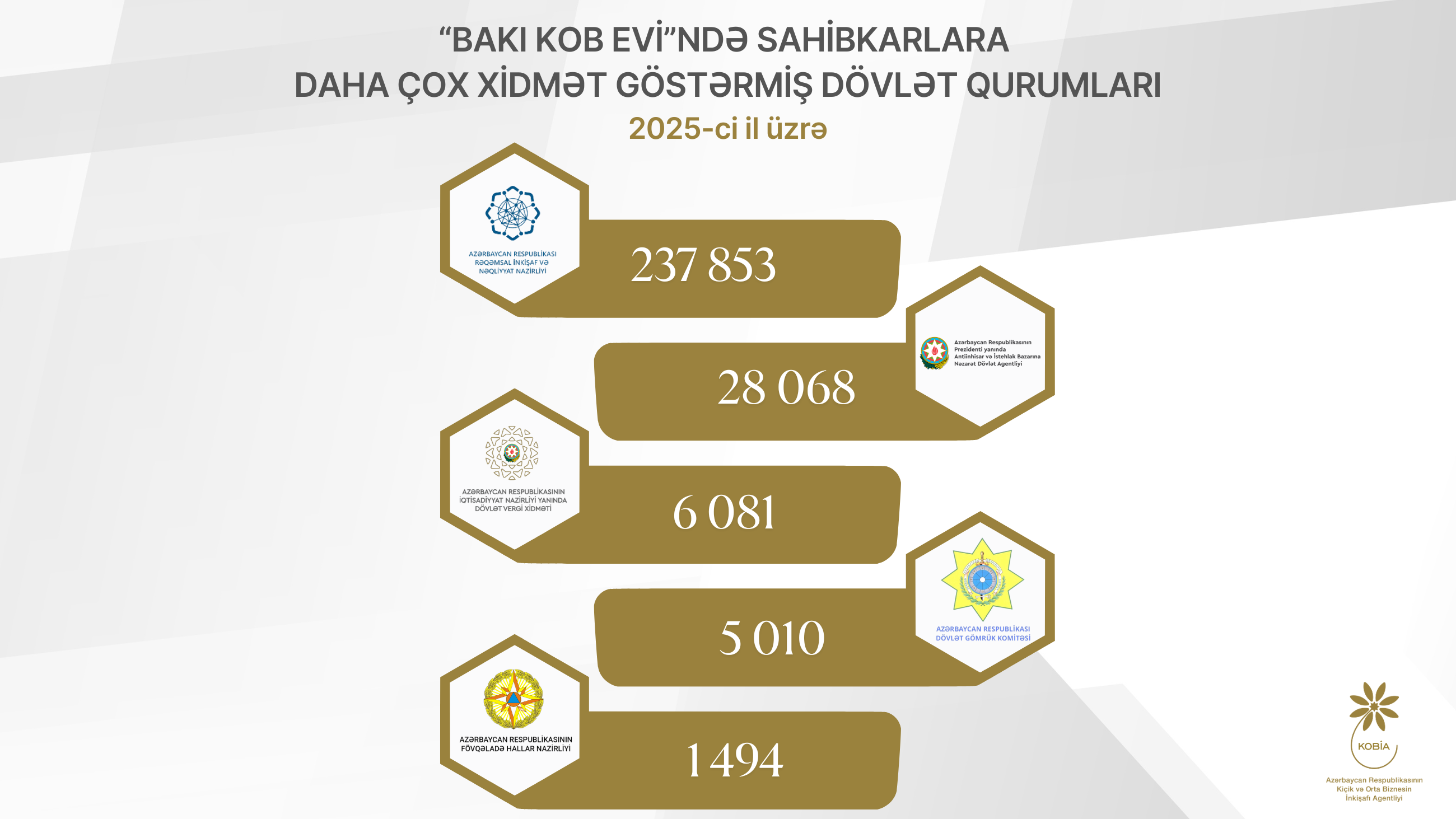 2025-ci ildə sahibkarlar KOB evlərinə daha çox yükdaşımaları həyata keçirmək üçün icazə blankı, fərqlənmə nişanı, poçt göndərişləri, mənşə sertifikatı, gömrük ximətləri, fitosanitar sertifikatın alınması üçün müraciət ediblər. Ötən il KOB evlərində sahibkarlara daha çox “G2B” xidmət göstərmiş qurumlar aşağıdakılardır: