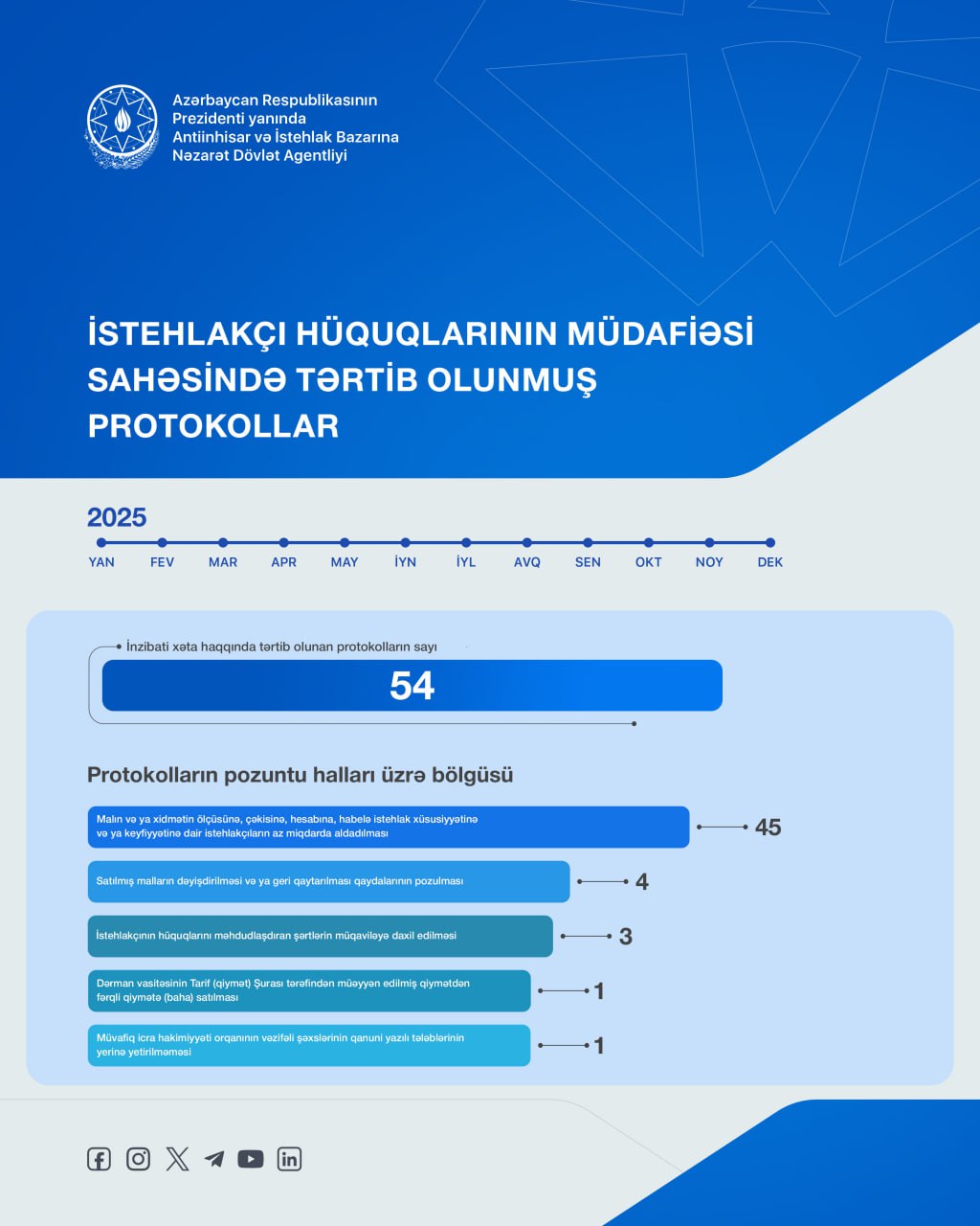 2025-ci il ərzində Antiinhisar və İstehlak Bazarına Nəzarət Dövlət Agentliyi tərəfindən vətəndaş müraciətlərinin araşdırılması zamanı təqdim olunan sübutlara əsasən 54 inzibati xəta haqqında protokol tərtib edilib və qanunamüvafiq tədbirlər görülüb.