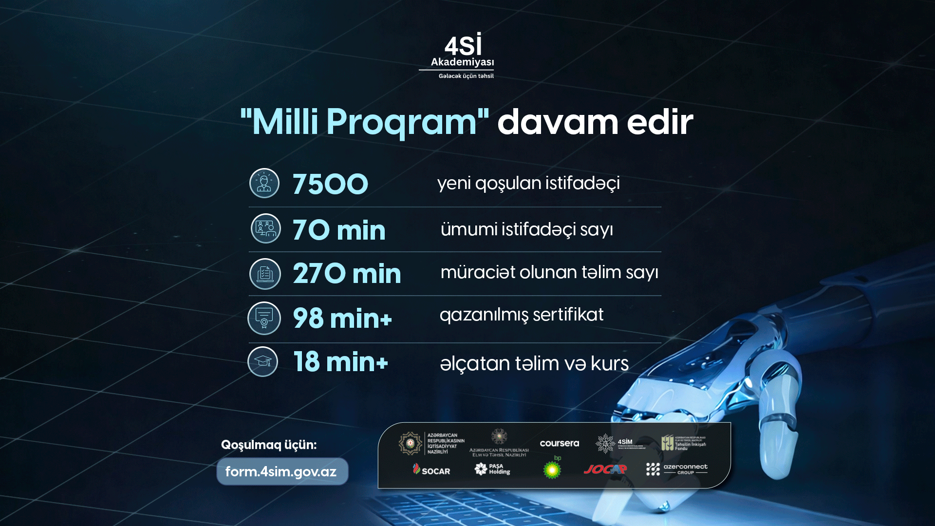 İqtisadiyyat Nazirliyinin tabeliyində Dördüncü Sənaye İnqilabının Təhlili və Koordinasiya Mərkəzi (4SİM) və Elm və Təhsil Nazirliyinin tabeliyində Təhsilin İnkişafı Fondunun (TİF) birgə icra etdiyi “4Sİ Akademiyası” çərçivəsində “Milli Proqram” istifadəçilərinin sayı 70 min nəfər olub. Növbəti 7500 vətəndaş dörd həftə müddətində “Coursera” onlayn təhsil platformasında rəqəmsal bacarıqlar, süni intellekt, data analitikası, proqramlaşdırma, biznes və digər prioritet sahələr üzrə beynəlxalq səviyyəli təlimlərdən yararlanmağa başlayıb.