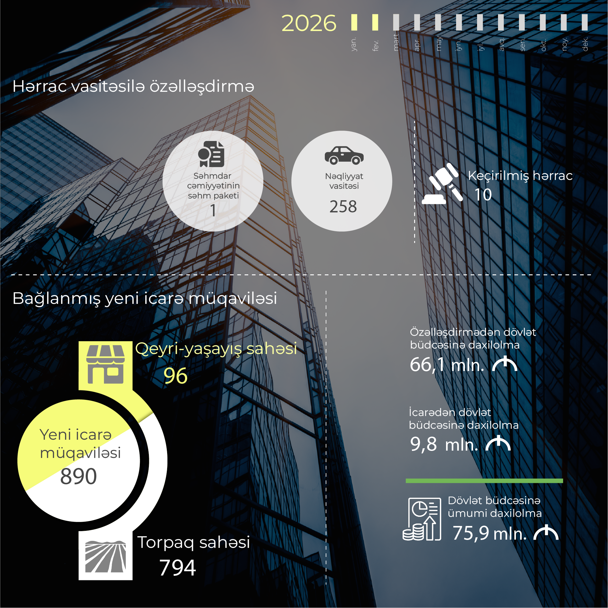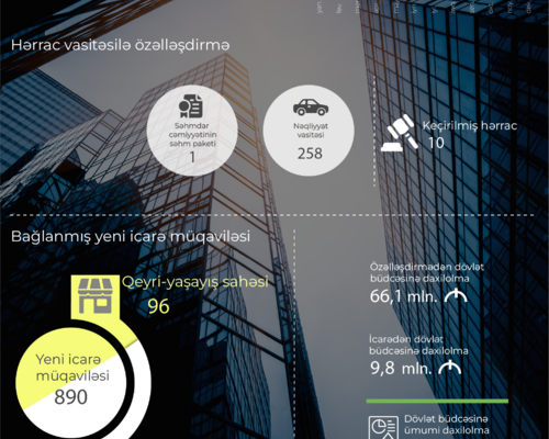 2026-cı ilin yanvar-fevral ayları ərzində İqtisadiyyat Nazirliyi yanında Əmlak Məsələləri Dövlət Xidməti tərəfindən 10 hərrac keçirilib. Hərraclarda 1 səhmdar cəmiyyətinin səhm paketi və 258 nəqliyyat vasitəsi özəlləşdirilib. Hesabat dövründə özəlləşdirmədən dövlət büdcəsinə daxilolmalar 66,1 milyon manat təşkil edib.