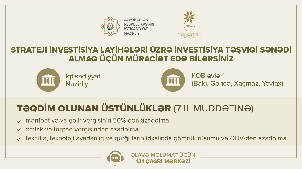 İnvestisiya təşviqi sənədinin verilməsi nəzərdə tutulan strateji investisiya layihələrinin istiqamətləri və təşviq sənədini almaq üçün lazım olan sənədlər barədə İqtisadiyyat Nazirliyinin tabeliyində Kiçik və Orta Biznesin İnkişafı Agentliyinin (KOBİA) 131 Çağrı Mərkəzinə müraciət etməklə ətraflı məlumat əldə etmək olar.