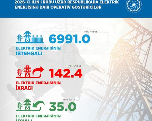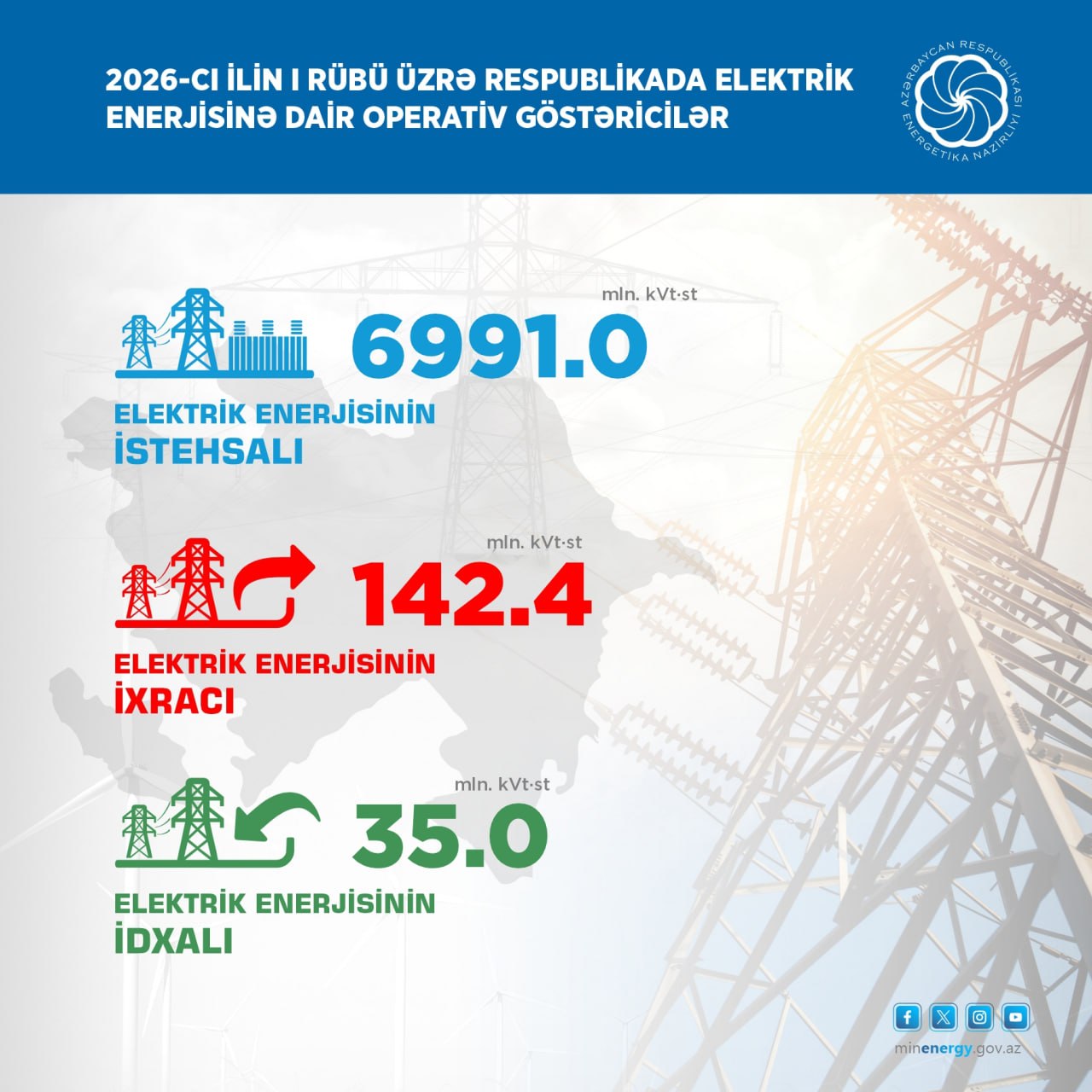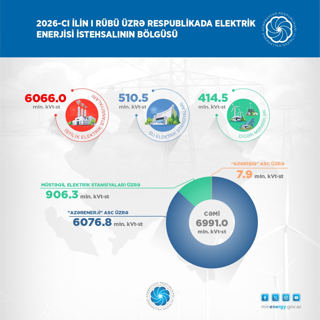 2026-cı ilin 1-ci rübü üzrə operativ məlumatlara əsasən, Azərbaycanda elektrik enerjisinin istehsalı 6 991 mln. kVt·st olub.