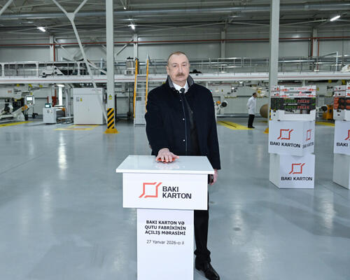 Azərbaycan Respublikasının Prezidenti İlham Əliyev yanvarın 27-də Sumqayıt Sənaye Parkında “Bakı Karton və Qutu Fabriki” MMC-nin karton və qutu taralarının istehsalı müəssisəsinin açılışında iştirak edib.