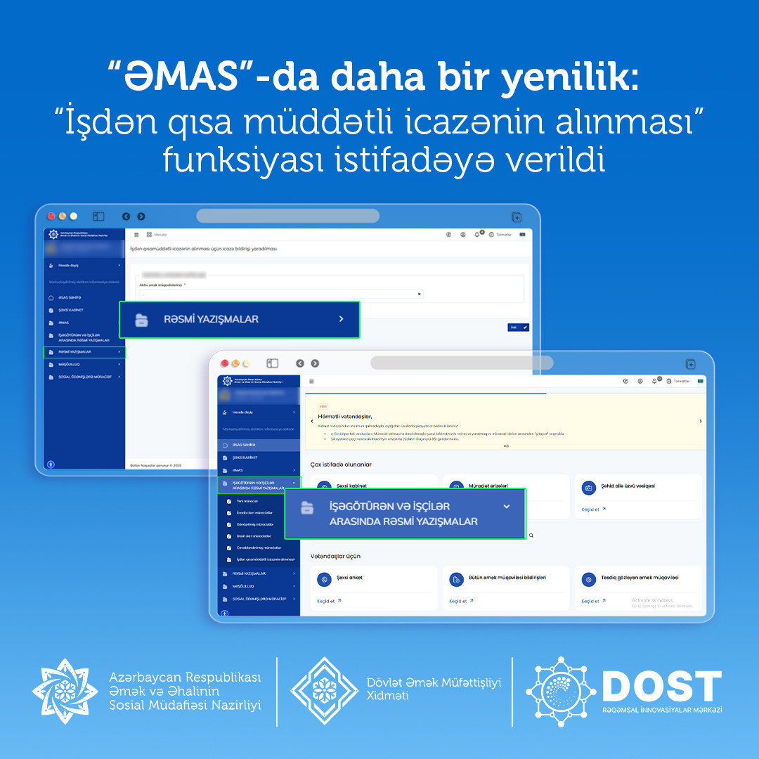“Əmək və məşğulluq” altsisteminin “İşəgötürən və işçi arasında rəsmi yazışmalar” bölməsi genişləndirilərək yeni – “İşdən qısa müddətli icazənin alınması” adlı altbölmə əlavə olunub.