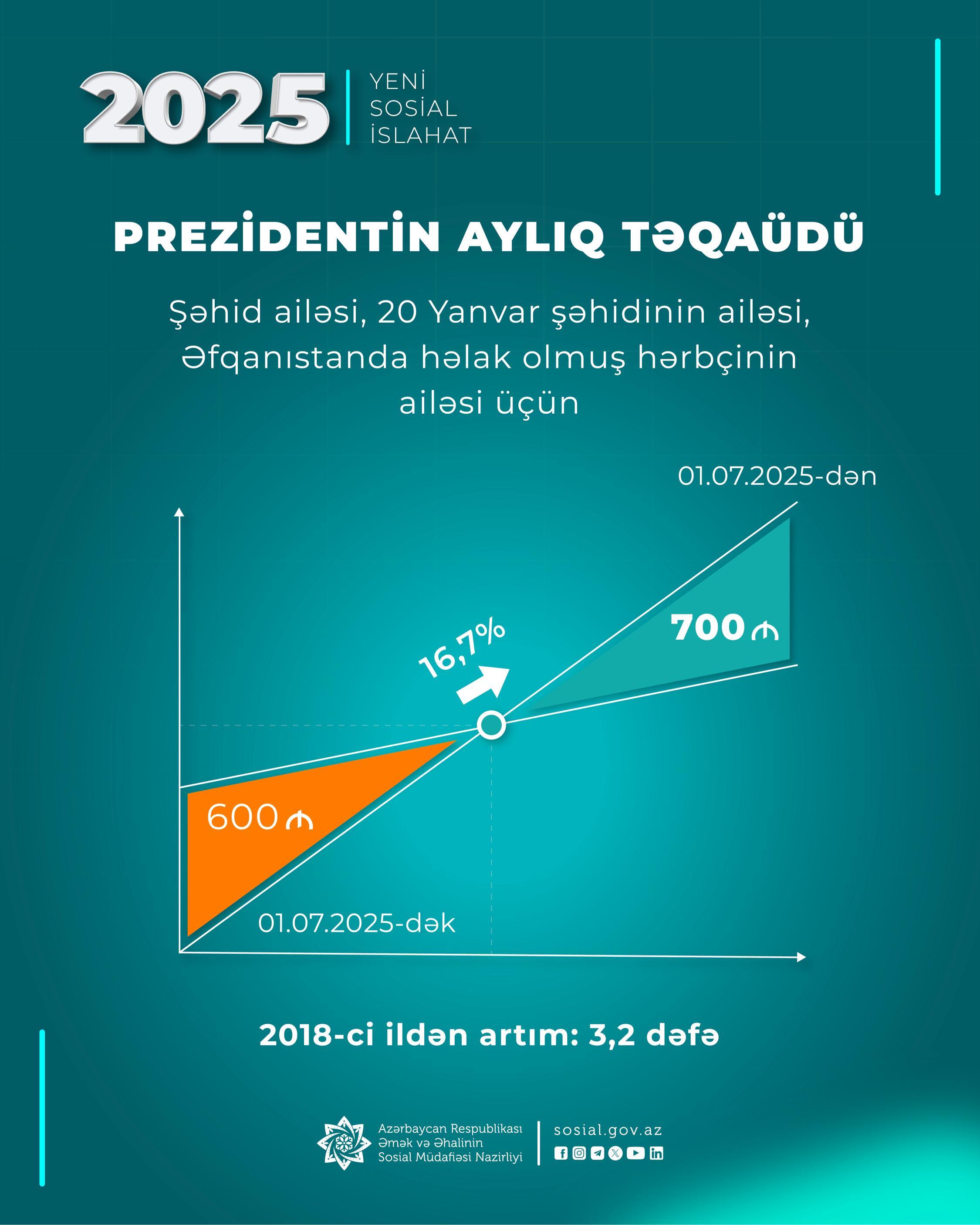 Şəhid ailəsi, 20 Yanvar şəhidinin ailəsi, Əfqanıstanda həlak olan hərbçilərin ailələri üçün Prezidentin aylıq təqaüdü – 700 manata çatdırılır;