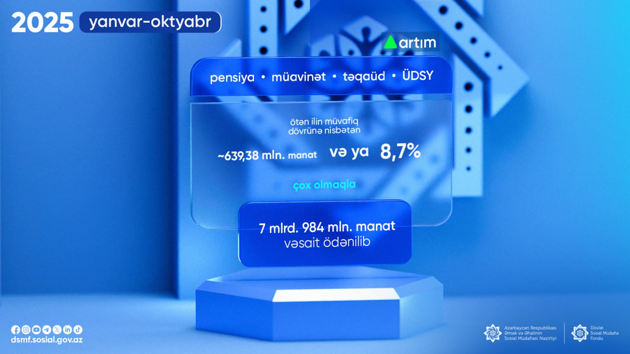 2025-ci ilin yanvar-oktyabr ayları ərzində pensiya, müavinət, təqaüd və ünvanlı dövlət sosial yardımları üzrə əhaliyə 7,984 milyard manat vəsait ödənilib.