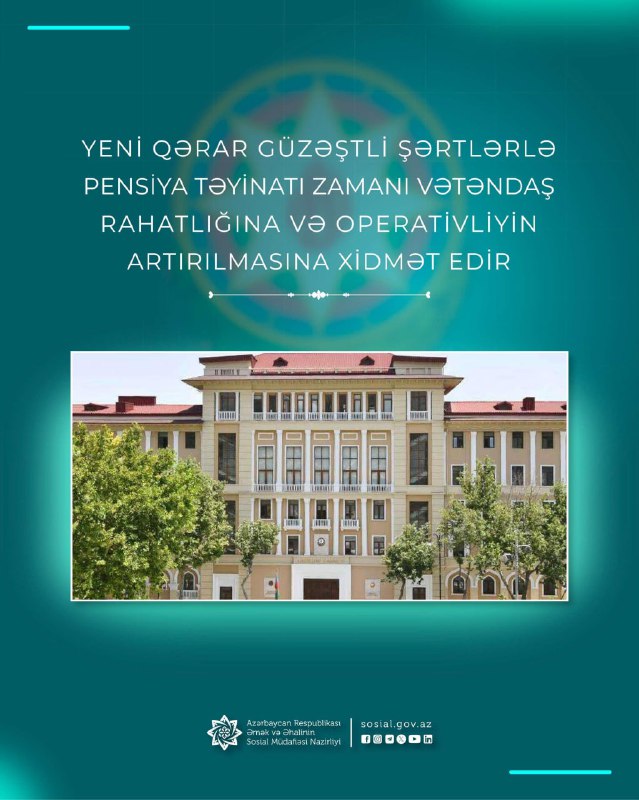 Nazirlər Kabinetinin yeni Qərarı ilə “Əmək pensiyalarının təyin edilməsi, hesablanması, yenidən hesablanması, bir növdən başqa növə keçirilməsi və ödənilməsi Qaydası”nda edilən yeni dəyişiklik vətəndaşyönümlü olmaqla, güzəştli şərtlərlə pensiya təyinatı zamanı vətəndaş rahatlığına və operativliyin artırılmasına xidmət edir.
