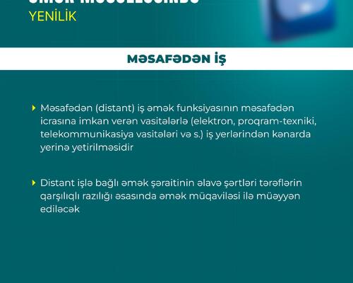 Yeni dəyişikliklərdən biri işçilər tərəfindən əmək funksiyasının elektron, proqram-texniki və s. vasitələrlə distant iş formasında yerinə yetirilməsinin hüquqi əsasının yaradılmasına xidmət edir. Bu məqsədlə Məcəlləyə "Məsafədən (distant) iş" anlayışı da daxil edilib. Distant işlə bağlı əmək şəraitinin əlavə şərtləri tərəflərin qarşılıqlı razılığı əsasında əmək müqaviləsi ilə müəyyən olunacaq.
