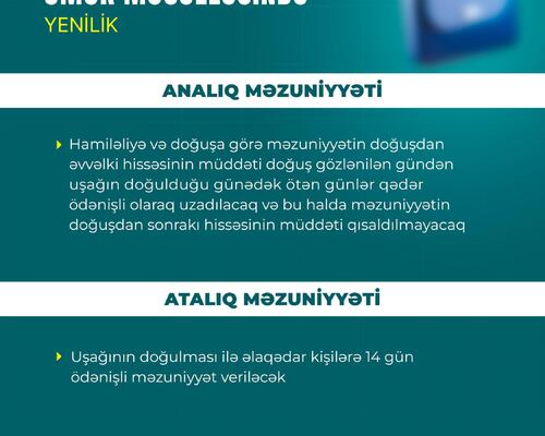 - Hamiləliyə və doğuşa görə məzuniyyətin doğuşdan əvvəlki hissəsinin müddətinin doğuş gözlənilən gündən uşağın doğulduğu günədək ötən günlər qədər ödənişli olaraq uzadılması və bu halda məzuniyyətin doğuşdan sonrakı hissəsinin qısaldılmaması,