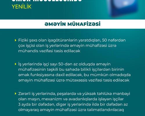- Fiziki şəxs olan işəgötürənlərin yaratdıqları, işçilərin sayı 50-dən çox olan iş yerlərində əməyin mühafizəsi üzrə mühəndis vəzifəsinin təsis edilməsi,