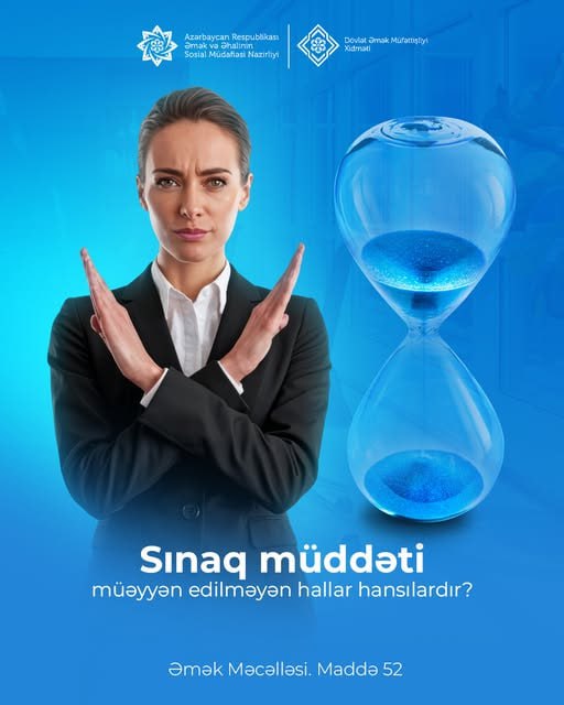 Əmək və Əhalinin Sosial Müdafiəsi Nazirliyi yanında Dövlət Əmək Müfəttişliyi Xidmətinin izahına görə, əmək müqaviləsi bağlanılarkən sınaq müddəti aşağıdakı hallarda müəyyən edilmir: