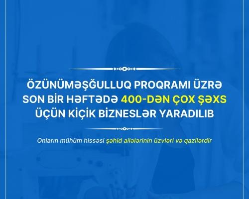 Özünüməşğulluq proqramı üzrə son bir həftədə 400-dən çox şəxs üçün kiçik bizneslər yaradılıb 22 Fevral 2022 13:22