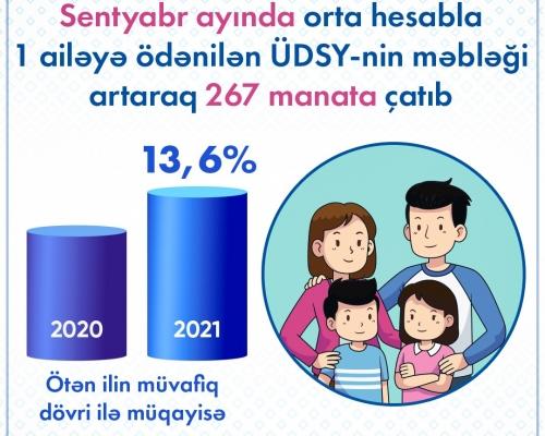 Sentyabrda orta hesabla 1 ailəyə ödənilən ünvanlı dövlət sosial yardımının məbləği 266,6 manata çatıb 7 Oktyabr 2021 11:22