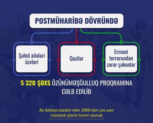 Şəhid ailələri üzvləri, qazilər və erməni terrorundan zərər çəkənlərdən ibarət 5320 şəxs özünüməşğulluq proqramına cəlb edilib 7 Oktyabr 2021 16:38