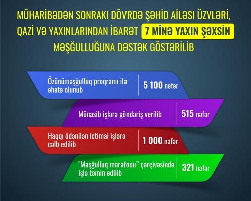 Müharibədən sonrakı dövrdə şəhid ailəsi üzvləri, qazi və yaxınlarından ibarət 7 minə yaxın şəxsin məşğulluğuna dəstək göstərilib 2 Avqust 2021 14:38