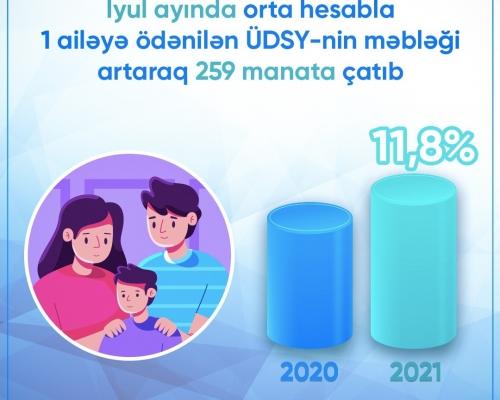 İyulda orta hesabla 1 ailəyə ödənilən ünvanli dövlət sosial yardımı məbləği artaraq 231,9 manatdan 259,3 manata çatıb 4 Avqust 2021 11:23