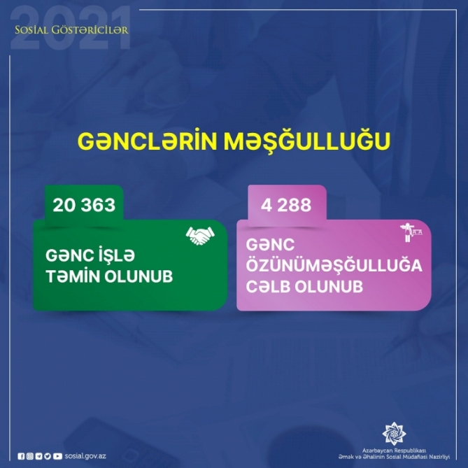 Təkcə 2021-ci il ərzində agentlik tərəfindən 20 min 363 gənc münasib işlə təmin edilib. Özünüməşğulluq proqramının icrasında da gənclərin iştirakına xüsusi əhəmiyyət verilir. Ötən il də 4 min 288 gənc özünüməşğulluq proqramına cəlb olunaraq, proqramın dəstəyi ilə öz kiçik biznes sahələrini yaradıb.