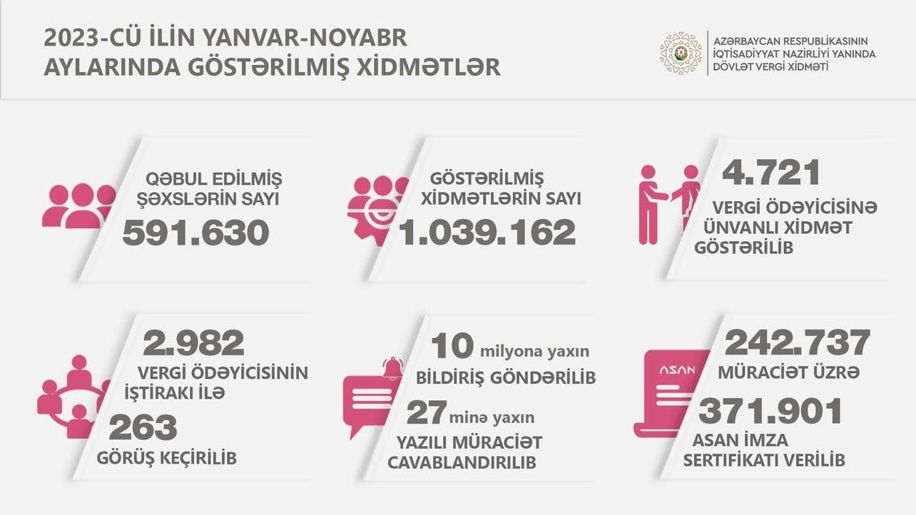 2023-cü ilin yanvar-noyabr ayları ərzində vergi ödəyicilərinə xidmət mərkəzlərində ümumilikdə 591.630 şəxs qəbul edilib və onlara 1.039.162 sayda xidmət göstərilib ki, bunlardan 287 minə yaxını şifahi (vergi qanunvericiliyi və inzibatçılığı ilə əlaqədar sualların cavablandırılması), 239 mindən çoxu isə elektron xidmətlərlə (bəyannamələrin və hesabatların, müxtəlif ərizələrin tərtibatına və elektron formada göndərilməsinə köməklik göstərilməsi) bağlı olub.
