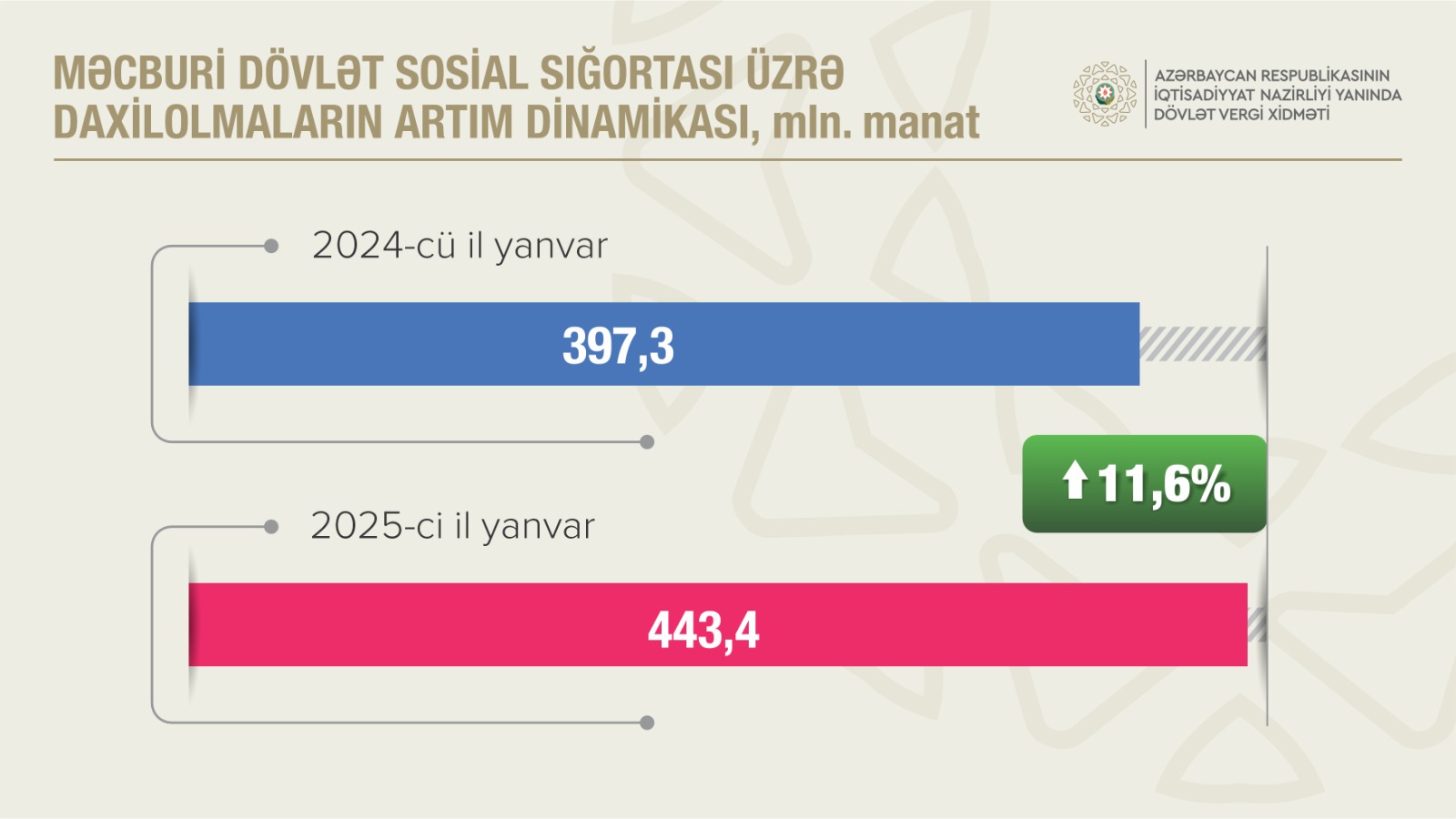 2025-ci ilin yanvar ayında muzdlu işçi sayının və əməkhaqqı fondunun “ağarması” prosesi şəraitində məcburi dövlət sosial sığorta haqları üzrə daxilolmalar 443,4 milyon manatdan çox olub. Bu mənbədən daxilolmalar əvvəlki ilin müvafiq dövrü ilə müqayisədə 11,6 faiz və ya 46,1 milyon manatdan çox artıb. Qeyri-büdcə təşkilatları üzrə daxilolmalar ötən ilin eyni dövrü ilə müqayisədə 12,6 faiz artaraq 321,0 milyon manatdan çox olub.