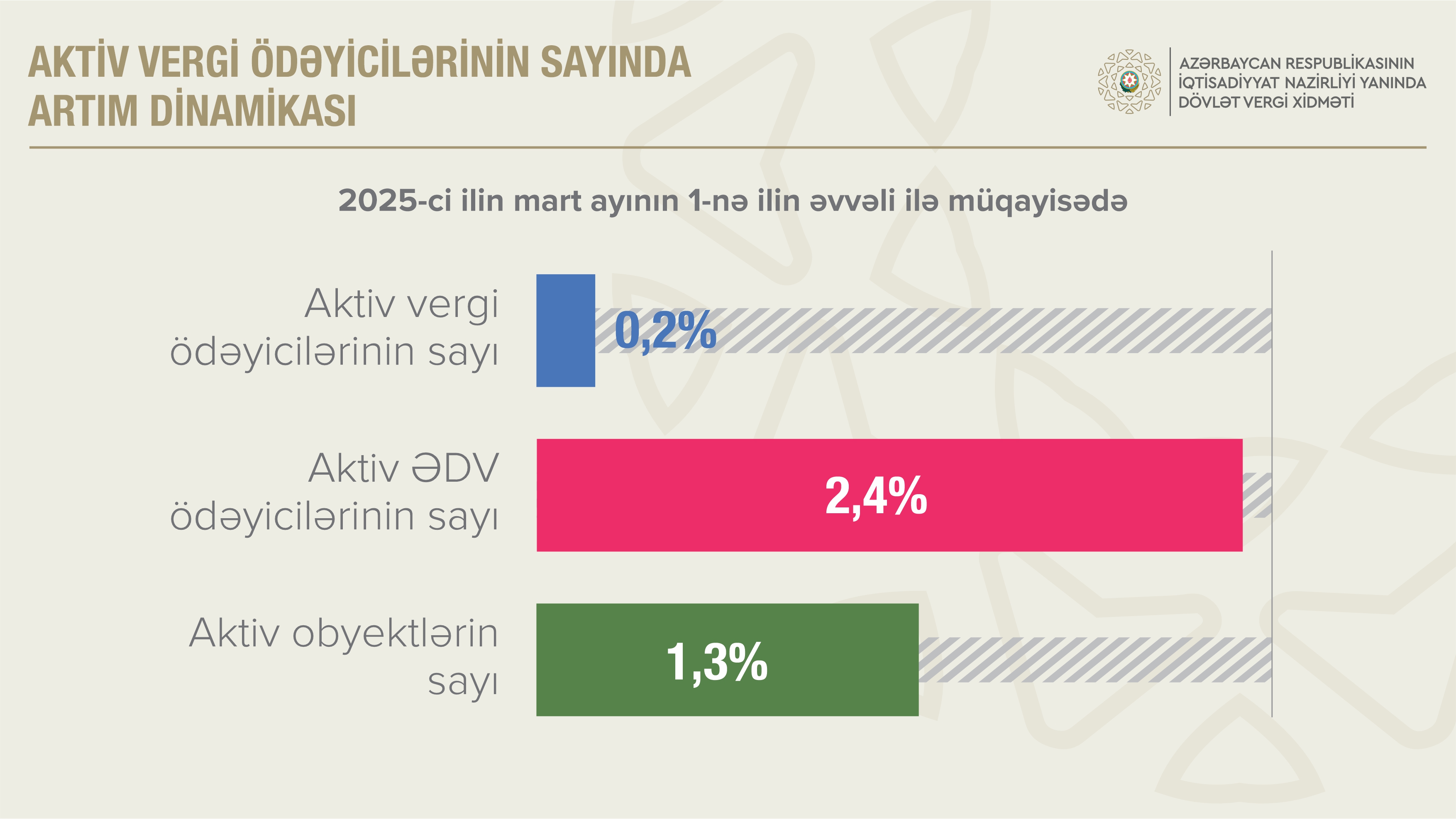 1 mart 2025-ci il tarixə aktiv vergi ödəyicilərinin sayı ilin əvvəli ilə müqayisədə 0,2 faiz artaraq 808,4 min, aktiv ƏDV ödəyicilərinin sayı isə 2,4 faiz artaraq 54,1 min təşkil edib. Həmin tarixə aktiv təsərrüfat subyektlərinin (obyektlərinin) sayı 1,3 faiz artıb və 220,2 min olub.
