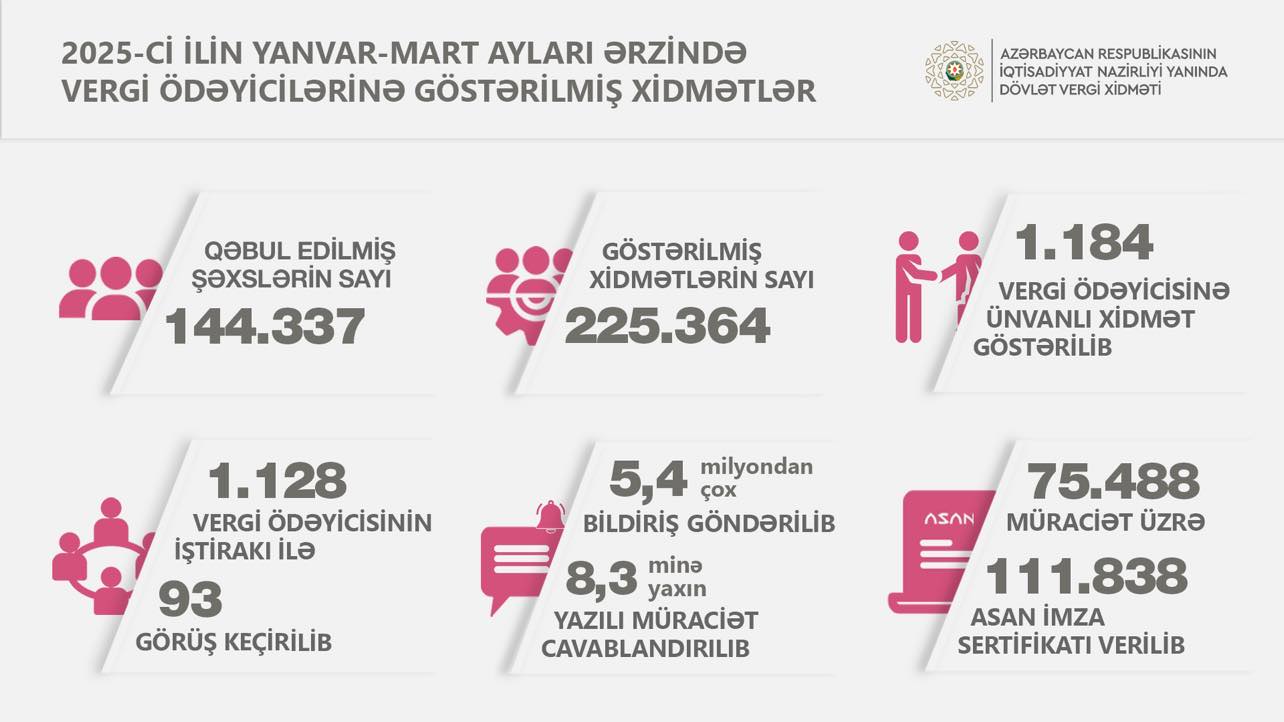 2025-ci ilin yanvar-mart ayları ərzində vergi ödəyicilərinə xidmət mərkəzlərində ümumilikdə 144.337 şəxs qəbul edilib, onlara 225.364 sayda xidmət göstərilib ki, bunlardan 76,6 minə yaxını şifahi xidmət (müraciət etmiş şəxslərin vergi qanunvericiliyi və inzibatçılığı ilə əlaqədar suallarının cavablandırılması), 51,1 minə yaxın sayda elektron xidmət (bəyannamələrin və hesabatların, habelə müxtəlif ərizələrin tərtibatına və elektron formada göndərilməsinə köməklik göstərilməsi) olub.
