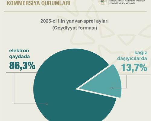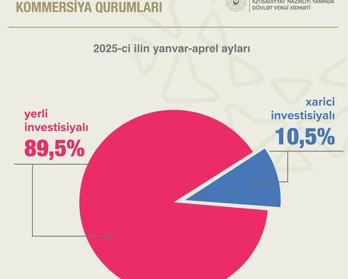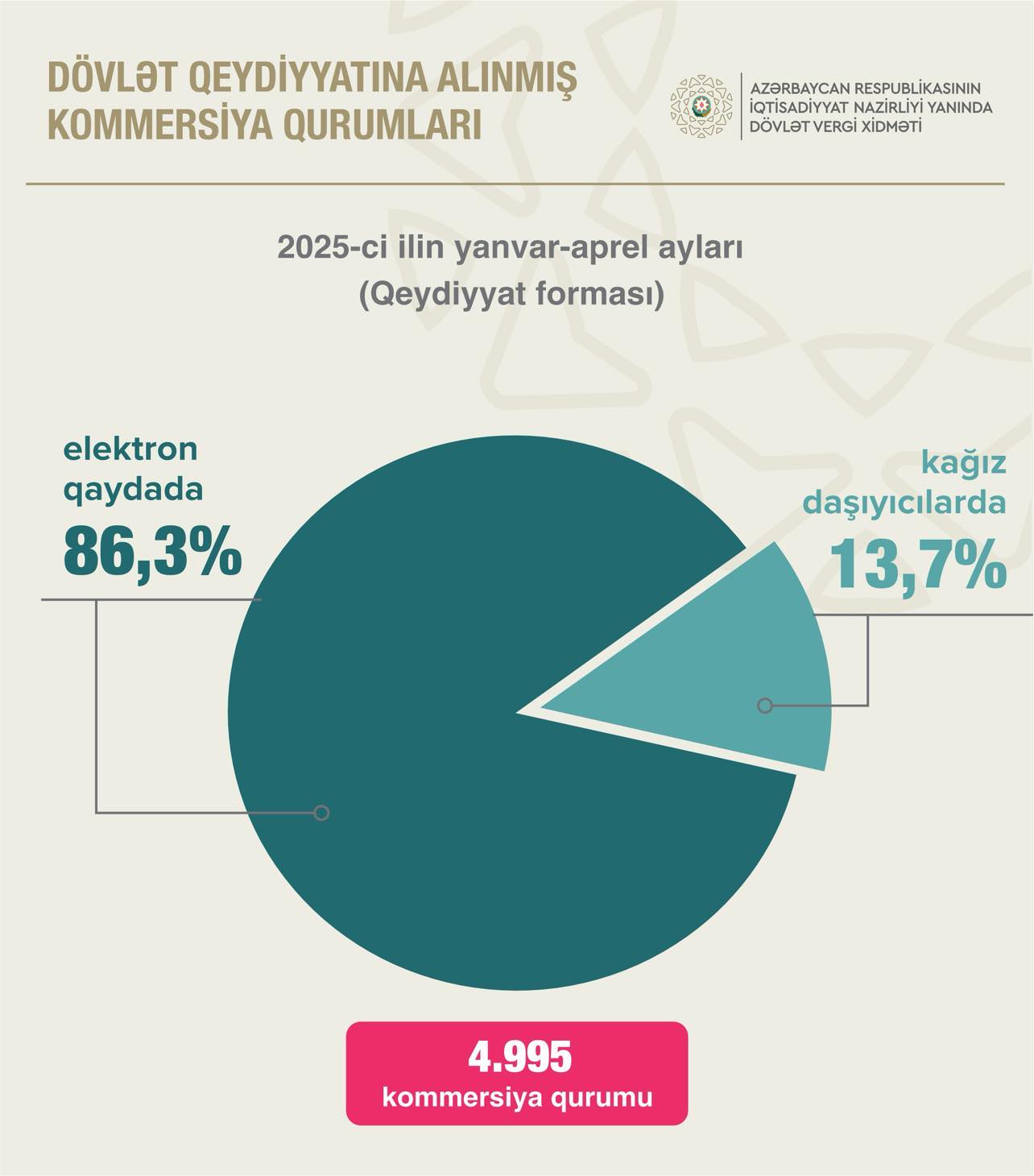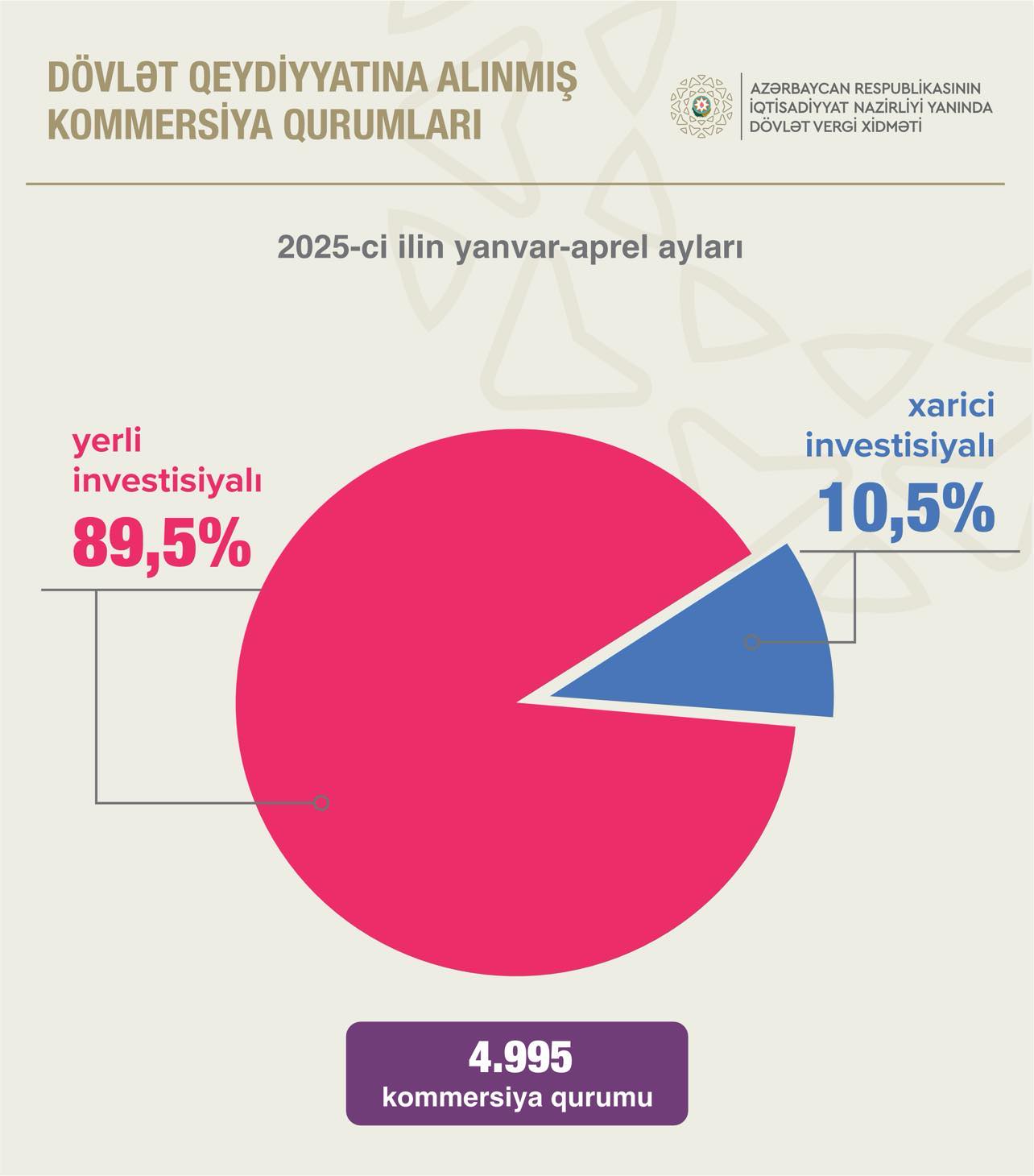 2025-ci ilin yanvar-aprel aylarında 4.995 vahid kommersiya qurumu dövlət qeydiyyatından keçib ki, onların da 89,5 faizi yerli investisiyalı, 10,5 faizi xarici investisiyalıdır. Kommersiya qurumlarının 86,3 faizi elektron qaydada qeydiyyata alınıb. Yerli investisiyalı məhdud məsuliyyətli cəmiyyətlərin e-qeydiyyatının xüsusi çəkisi 97,1 faiz təşkil edib.
