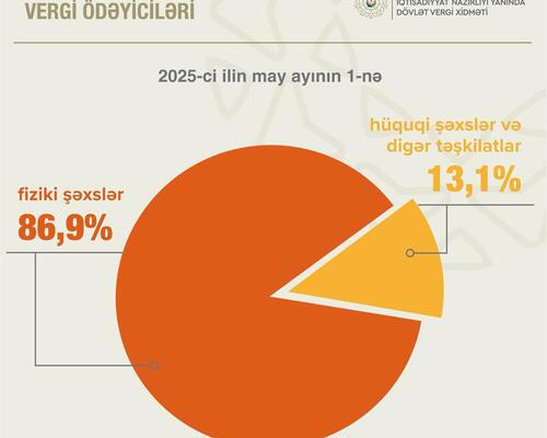 2025-ci ilin may ayının 1-nə respublika üzrə uçotda olan 1.621.818 vergi ödəyicisinin 86,9 faizi fiziki şəxslər, 13,1 faizi hüquqi şəxslər və digər təşkilatlar olub. Ötən ilin müvafiq dövrü ilə müqayisədə vergi ödəyicilərinin ümumi sayı 4,8 faiz, o cümlədən fiziki şəxslərin sayı 4,3 faiz, hüquqi şəxslərin sayı isə 7,7 faiz artıb. Dövlət qeydiyyatında olan kommersiya hüquqi şəxslərin 91,7 faizi məhdud məsuliyyətli cəmiyyət, 1,1 faizi səhmdar cəmiyyət, 1,1 faizi kooperativ və s. formalarda yaradılıb. May ayının 1-nə qeydiyyatda olan kommersiya qurumlarının sayı ötən ilin müvafiq dövrü ilə müqayisədə 8,4 faiz artaraq 195.263 vahid təşkil edib.