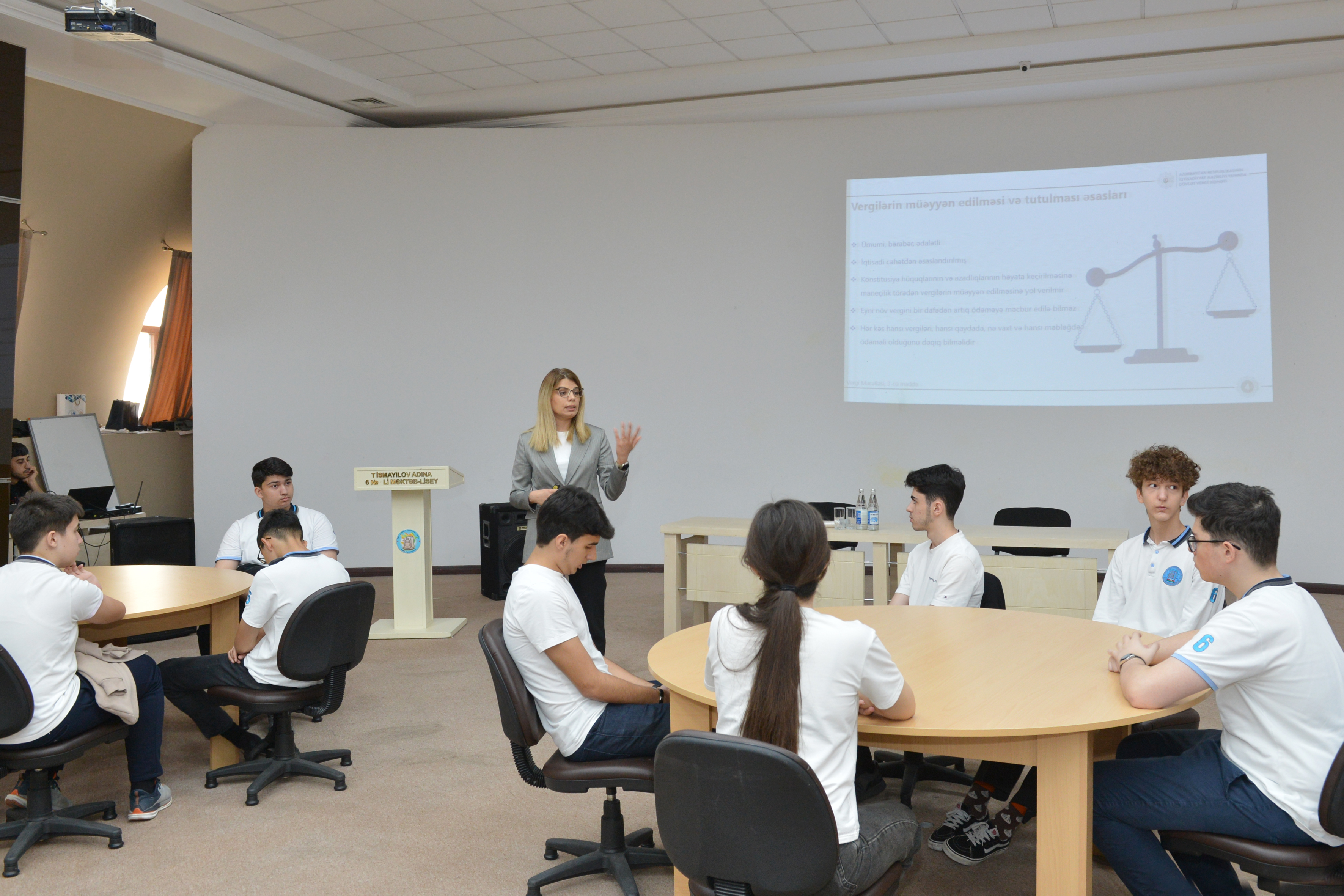 Gələcəyin vergi ödəyicilərinə vergi barədə ilkin anlayışlar, onun tətbiqinin məqsədi və ölkəmizin vergi sistemi barədə dolğun məlumat verilib, vergi ödəməyin cəmiyyət üçün faydaları, sosial üstünlükləri və dövlət büdcəsinin formalaşmasında mühüm rolu izah edilib. Bildirilib ki, hər bir vətəndaş dövlətin maliyyə sütunlarından birini təşkil edən vergini vaxtlı-vaxtında ödəməlidir. Bununla bağlı Azərbaycan Respublikasının Konstitusiyasında qeyd edilən məqamlar və Vergi Məcəlləsinin tələbləri barədə mühüm biliklər şagirdlərə təqdim edilib. Tədbir çərçivəsində ölkəmizdə tətbiq edilən vergi növləri və onların mahiyyəti diqqətə çatdırılıb. İnteraktiv formada keçirilmiş görüşdə iştirakçılara praktiki tapşırıqlar təqdim olunub və qrup müzakirələri təşkil edilib. Sonda şagirdlər üçün vergi və maliyyə savadlılığı üzrə maarifləndirici viktorina keçirilib, qaliblərə hədiyyələr təqdim olunub.