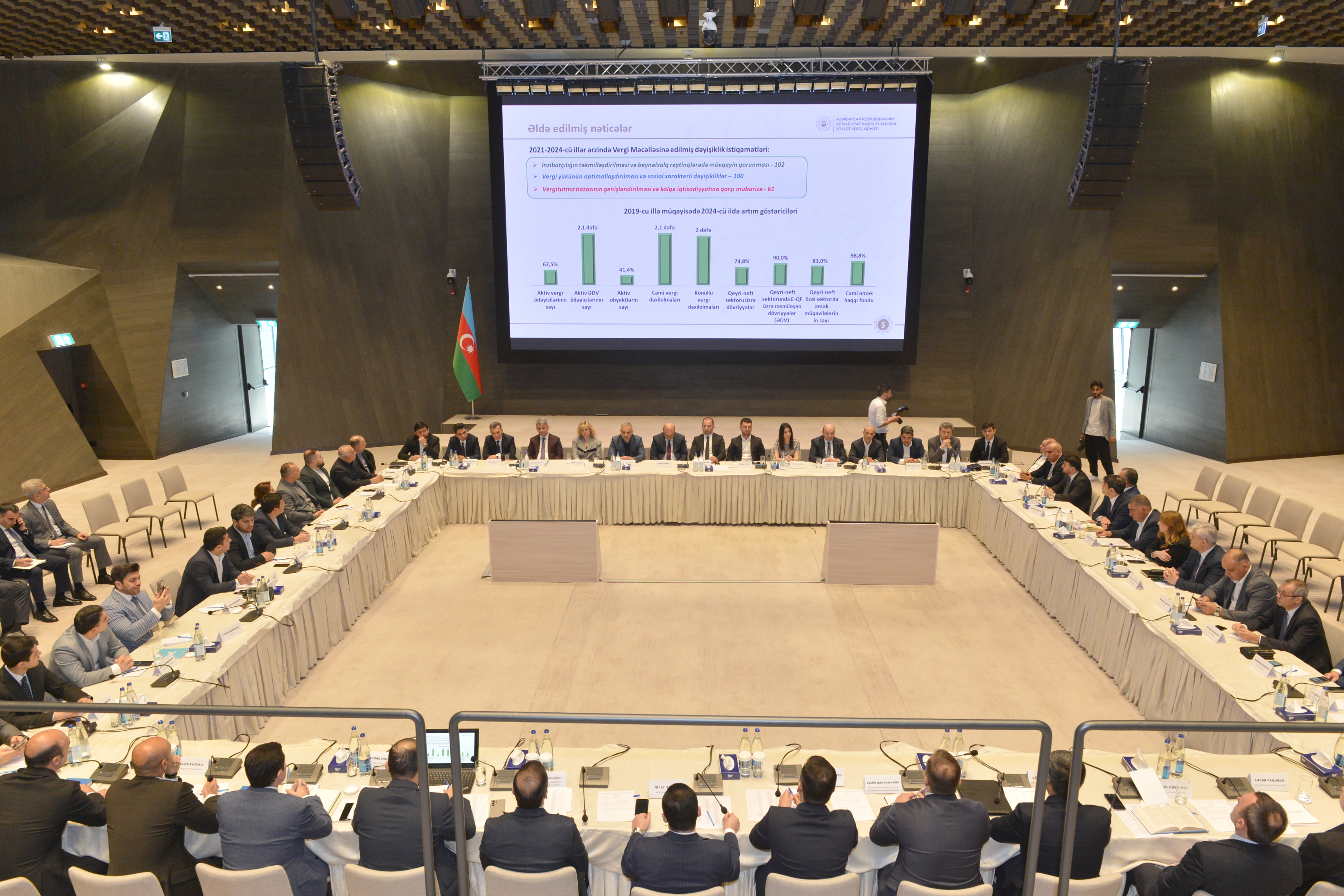 Görüşdə Vergi siyasəti baş idarəsinin Qanunvericiliyin monitorinqi və sahibkarlıq subyektləri ilə iş idarəsinin rəisi Əhməd Əhmədov təqdimatla çıxış edib və vergitutma sahəsində aparılan islahatlar, həyata keçirilən tədbirlər barədə danışıb. Tədbir iştirakçılarına son illərdə həyata keçirilən islahatlar nəticəsində iqtisadi göstəricilərdə əldə olunan müsbət dinamika, “kölgə iqtisadiyyatı” ilə mübarizə və biznes mühitinin stimullaşdırılması məqsədilə vergi qanunvericliyndə tətbiq olunan təşviqlər, vergi xidmətində rəqəmsallaşma sahəsində görülən işlər barədə ətraflı məlumat verilib. Bundan başqa, DVX-nin bizneslə qarşılıqlı əməkdaşlıq platforması çərçivəsində 280-ə yaxın görüş keçirildiyi, 680 təklifin emal olunduğu və həmin təkliflər əsasında vergi qanunvericliyi və inzibatçılığında 100-ə yaxın dəyişiklik edildiyi iştirakçıların diqqətinə çatdırılıb.