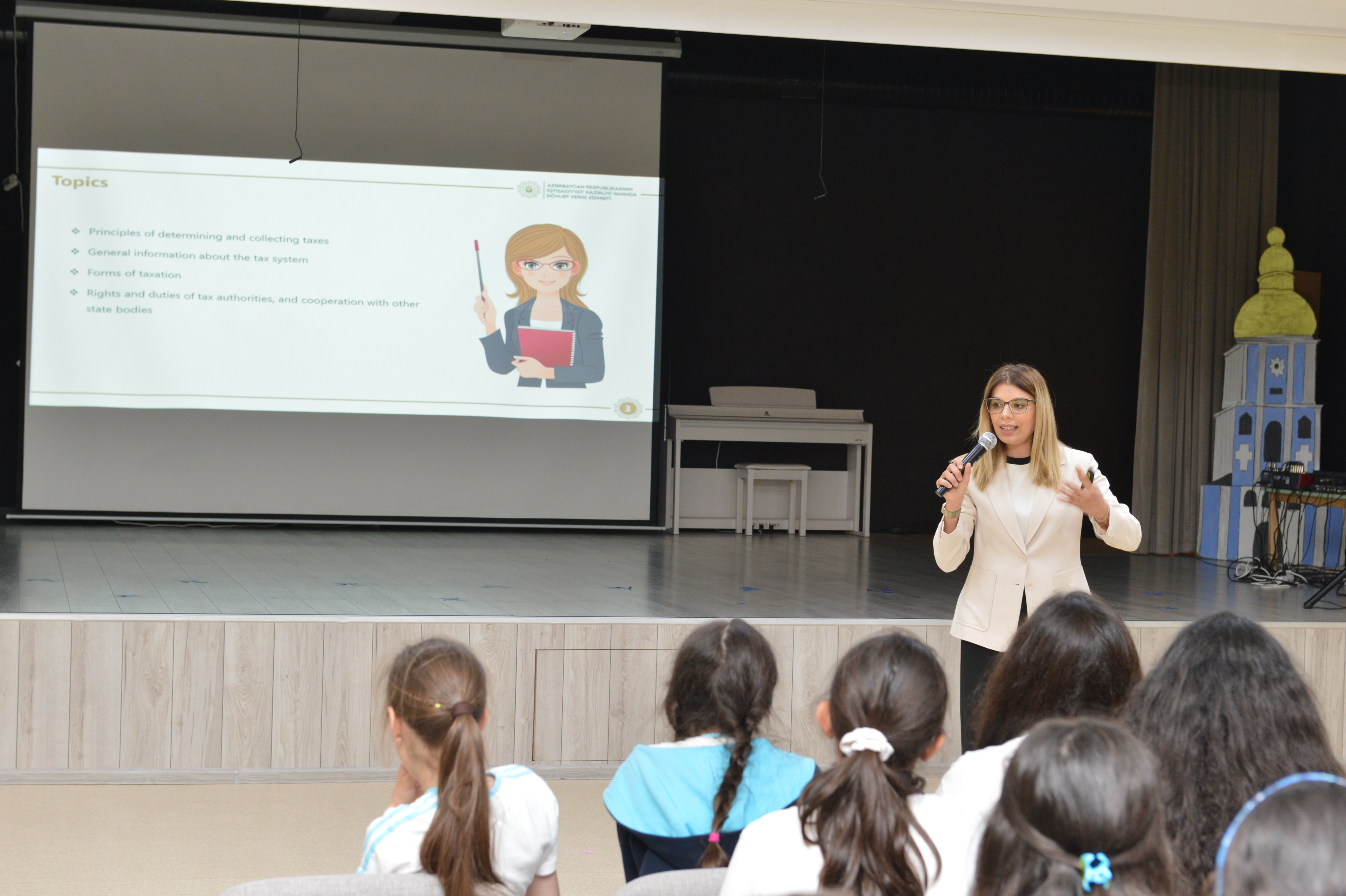 Tədbirdə DVX-nin Tədris Mərkəzinin nümayəndələri şagirdlərə vergilər və iqtisadiyyat barədə ilkin məlumatlar verərək ümumi anlayışları izah ediblər. Tədris Mərkəzinin şöbə rəisi Ülkər Kazımova gələcəyin vergi ödəyicilərinə vergilərin tətbiqinin məqsədi və ölkəmizin vergi sistemi barədə danışıb, vergi ödəməyin cəmiyyət üçün faydaları, sosial üstünlükləri və dövlət büdcəsinin formalaşmasında rolundan bəhs edib.